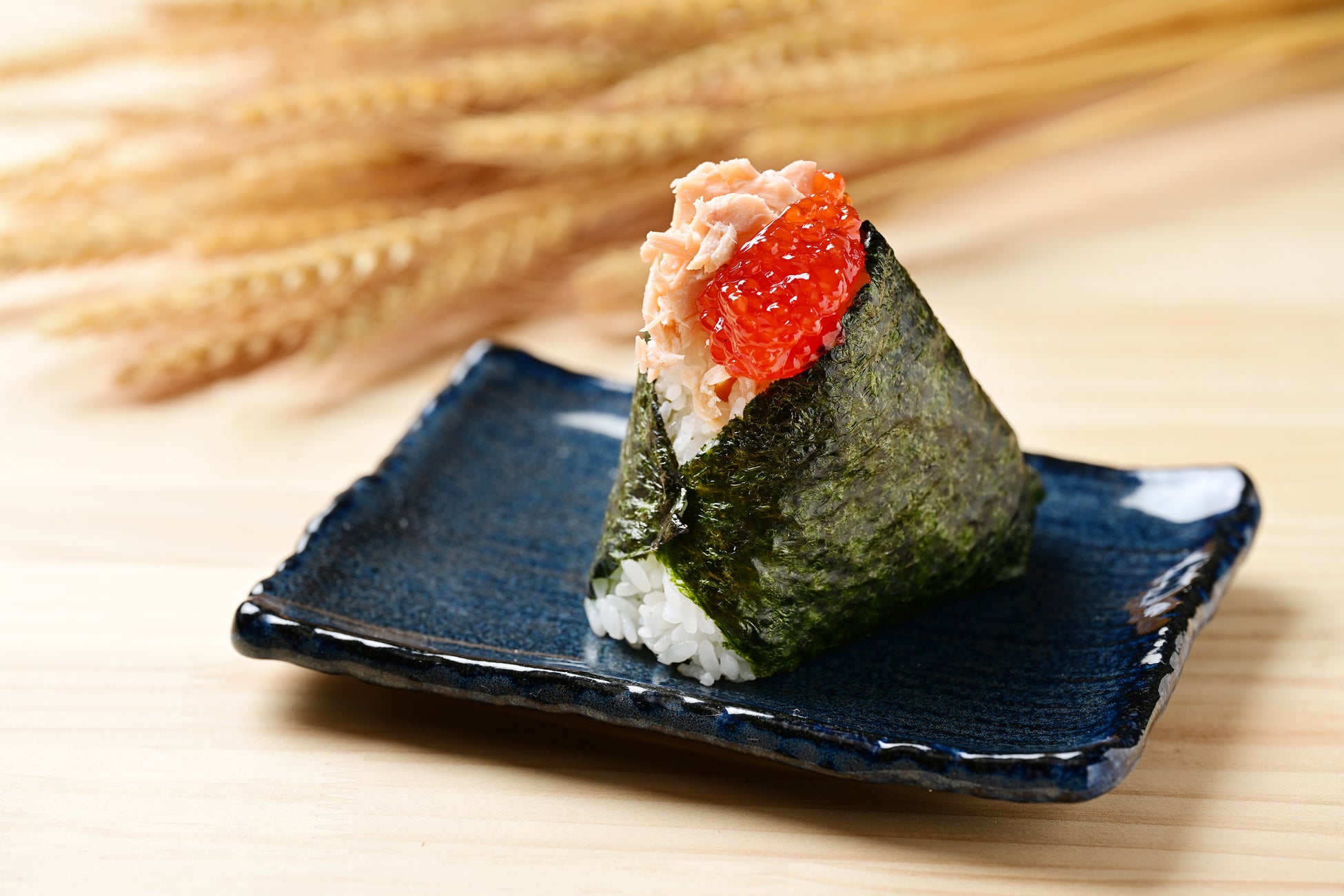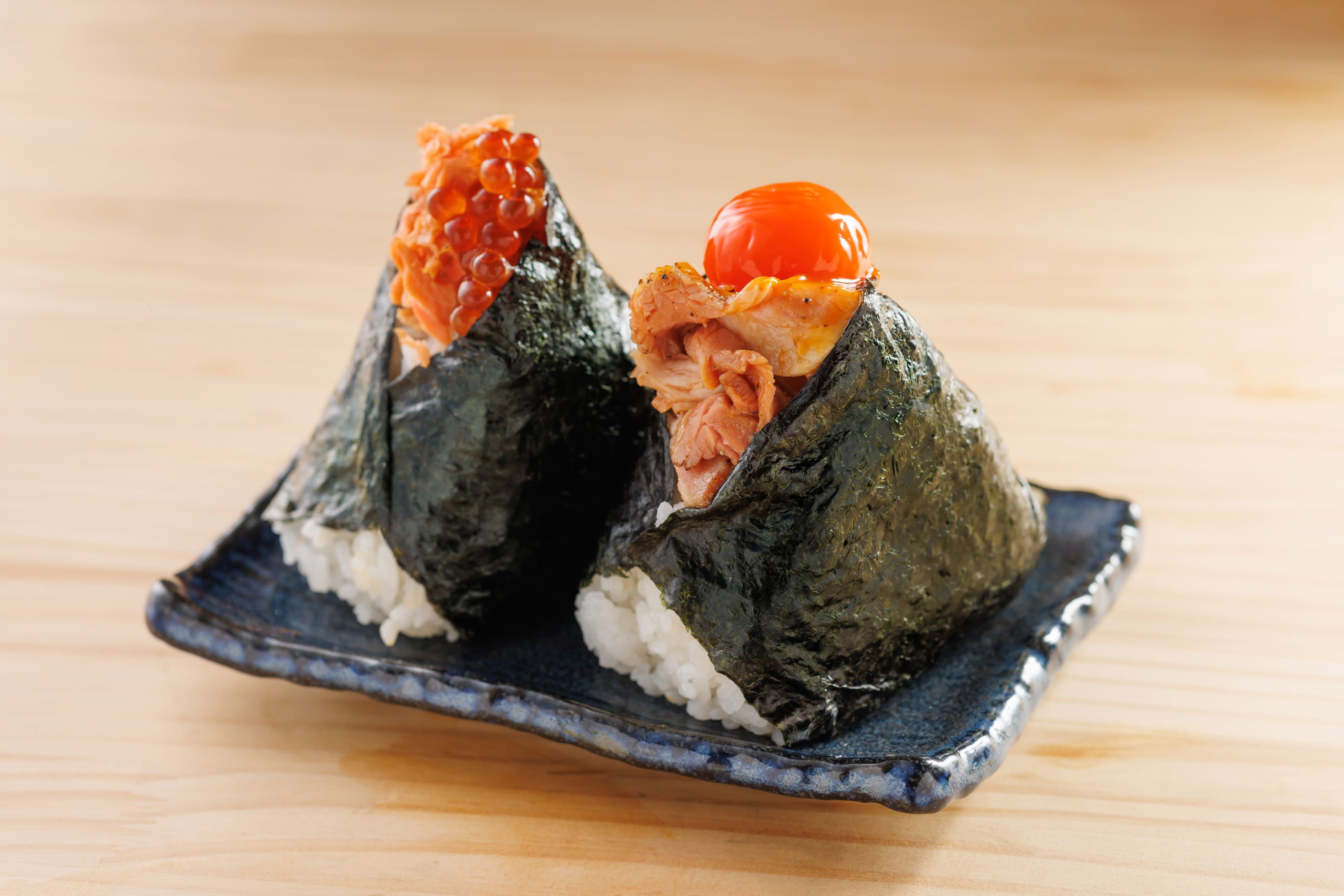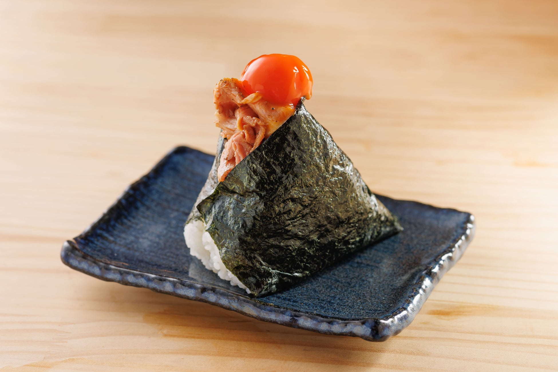 塩こうじで漬け込み、低温調理したしっとりやわらかく仕上げたレアチャーシュー、奇跡の玉子「満月たまご」の醤油漬けを上に乗せて仕上げております。チャーシューの旨味と卵黄のまったりさがふっくらおにぎりと良く合います。