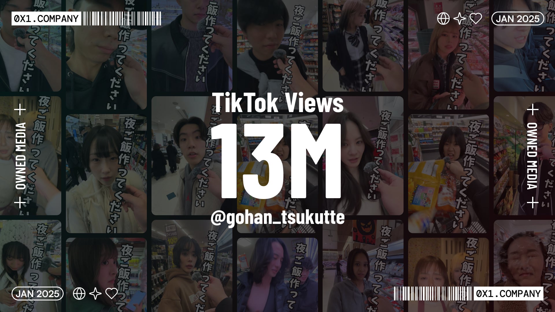 「知らない人の家に行って夜ご飯を作ってもらう」というコンセプトでTikTokアカウントを自社で運用。広告配信ゼロでも、わずか3ヶ月で驚異の1,300万回再生を記録するバズアカウントに。