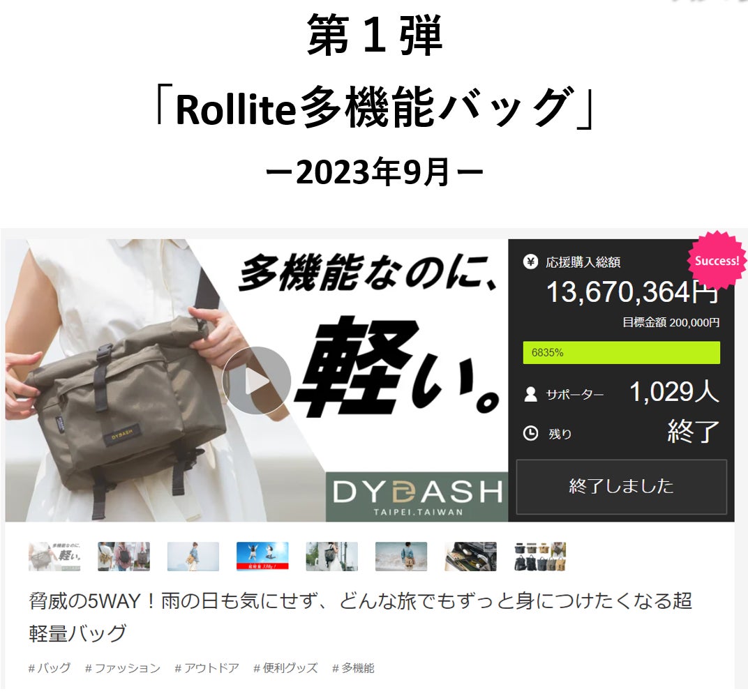 12“Mixバッグの前作となる「Rollite多機能バッグ」は、昨年9月より開始した先行予約販売にて、1,300万円を超える応援購入を集めました。台湾製バッグのプロジェクトとしては異例の大ヒットで、1,000人以上のサポーター様より応援購入を頂いております。