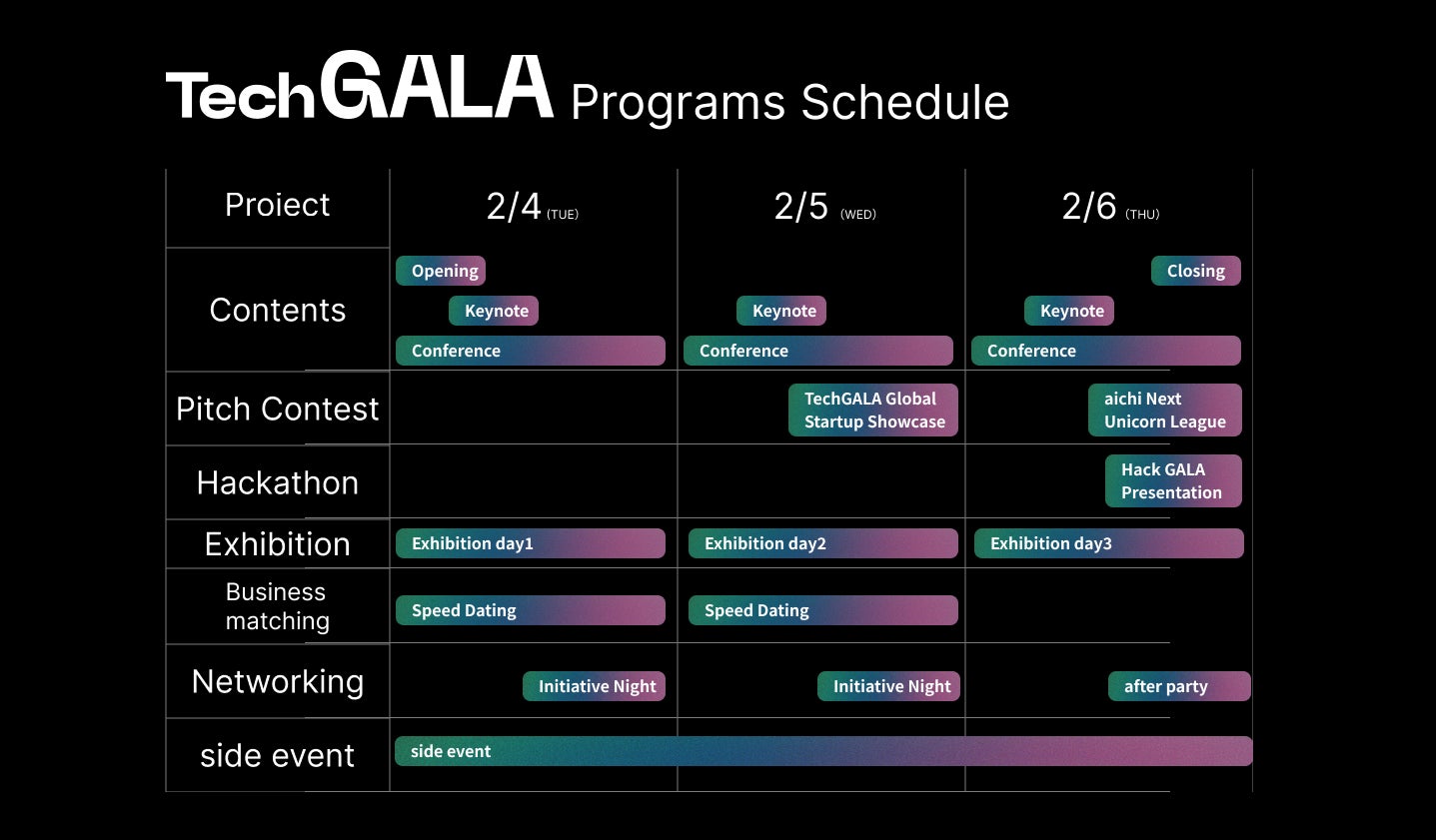 2025年2月4日から3日間開催される、地球の未来を拓くテクノロジーの祭典「TechGALA Japan」は、3日間を通して様々なプログラムを展開しています。