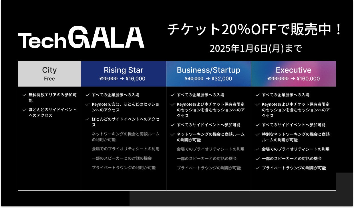 現在、期間限定でTechGALA参加パスを20%OFFで販売中です。