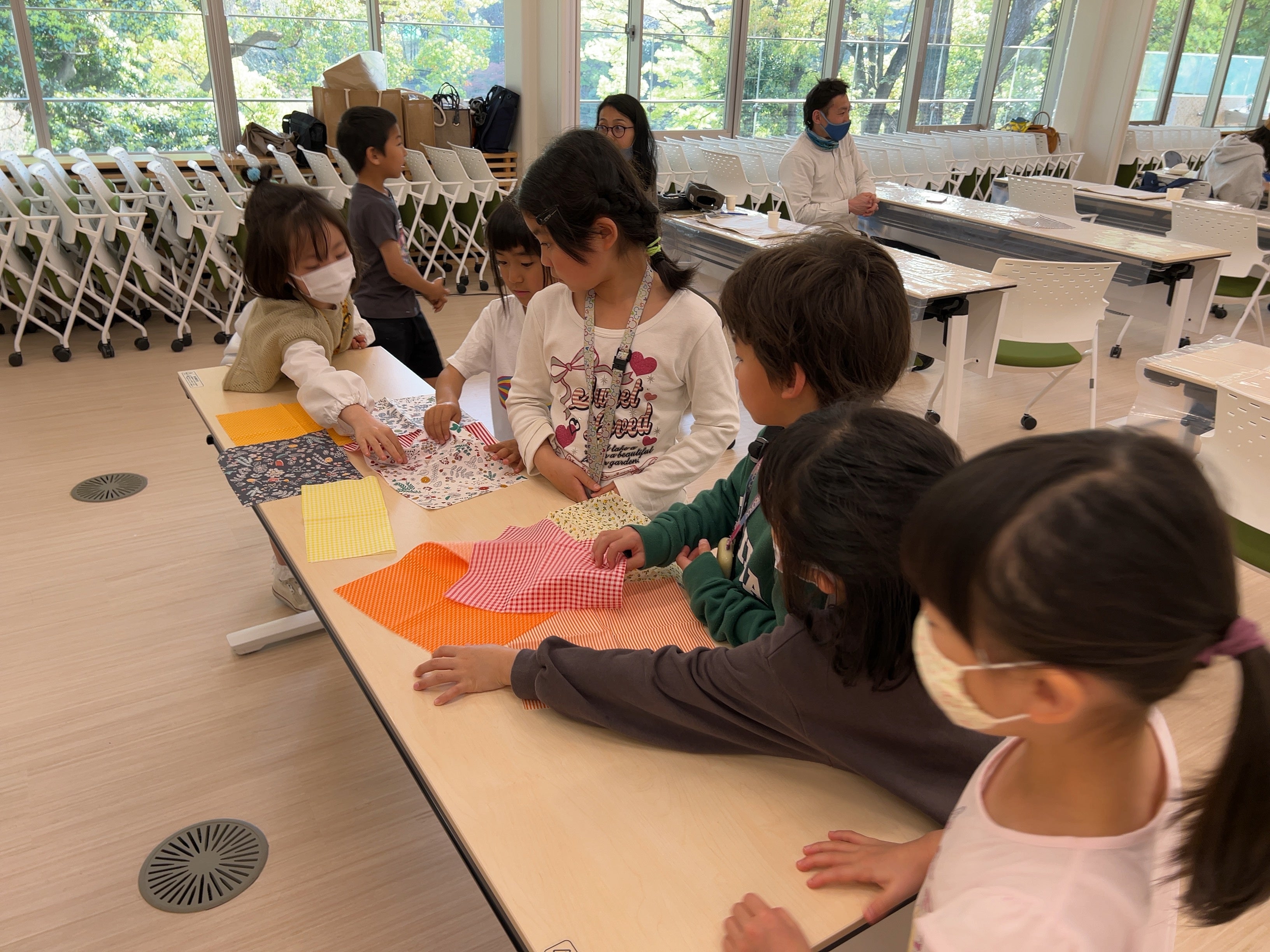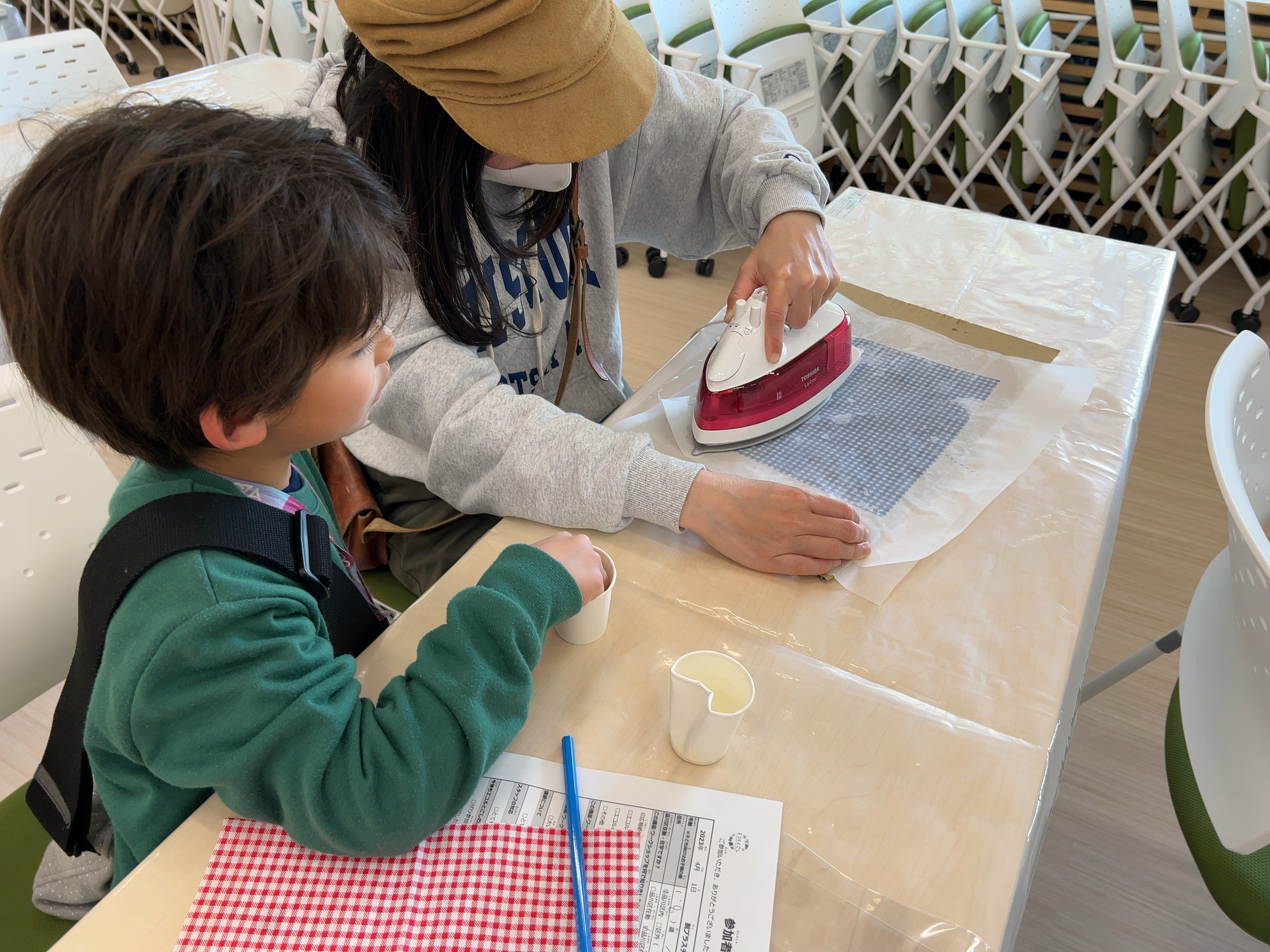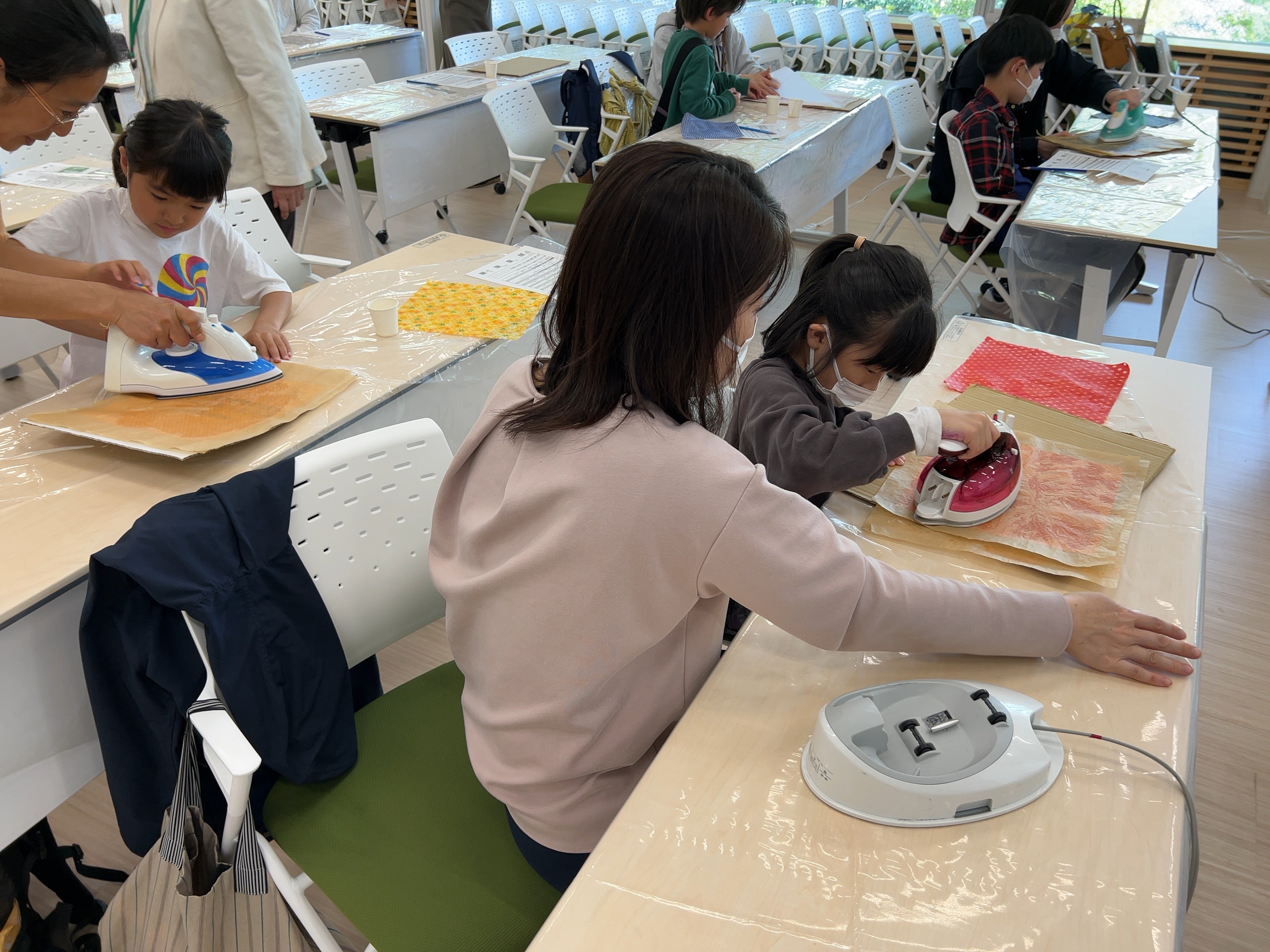 子どもたちは、好きな布を選び、広げた布にみつろうを置いていきます。お父さま・お母さまは、上からアイロンを当ててみつろうを溶かし、布全体に広げていきます。