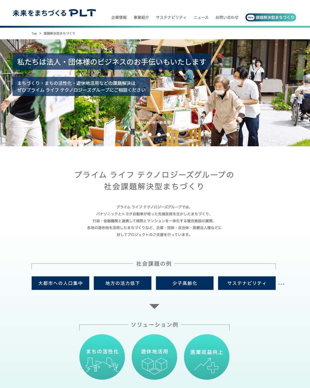 プライム ライフ テクノロジーズ株式会社とグループ5社(パナソニック ホームズ株式会社、トヨタホーム株式会社、ミサワホーム株式会社、パナソニック建設エンジニアリング株式会社、株式会社松村組)は、7月に制定したグループブランド「未来をまちづくるPLT」(※1)を核としたブランド戦略の一環として、このたび、プライム ライフ テクノロジーズ社公式サイト内に、まちづくり事業者を対象としたWEBページを新たに開設しました。同ページでは、大都市への人口集中や地方の活力低下など、様々な社会課題に対するグループ会社のまちづくりを通じたソリューション事例を紹介。あわせて、まちづくりに関するグループとしての総合問い合わせ窓口を設け、ご相談受付を促進するとともに、グループ各社の総力を挙げて対応する体制を構築していきます。