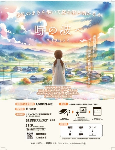 福島県浜通り地域のまちづくりに取り組む一般社団法人NoMAラボ(代表:高橋大就)は、東日本大震災時の原発事故により全町避難となった福島県浪江町を舞台として、先日「SDGs岩佐賞」を受賞した「なみえアートプロジェクト」の作品をはじめ、浪江町内に点在する屋外アートに隠された謎を解いて回りながら、町の記憶を継承し、町の未来を考える謎解きアドベンチャー「時の波へ」を制作、このたび11月2日(土)より、浪江町内にて謎解きキットの一般販売を開始します。