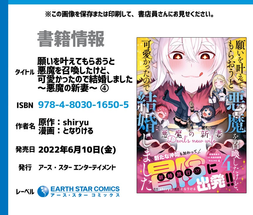 現在コミック アース・スターで掲載している人気作品『願いを叶えてもらおうと悪魔を召喚したけど、可愛かったので結婚しました〜悪魔の新妻〜』コミックス第4巻を6月10日(金)に発売いたします。