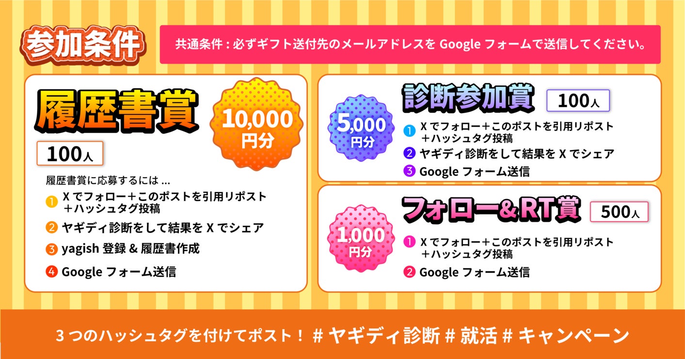 本キャンペーン「yagish履歴書×ディグラム診断で見つける”あなたに合う仕事”」は、自己分析から履歴書作成までのプロセスを楽しみながら取り組んでいただける就活支援企画です。