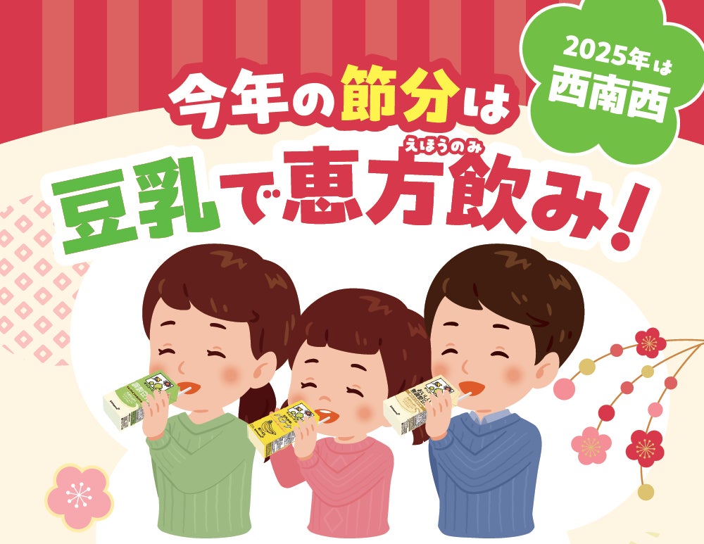 こうした中でキッコーマンソイフーズでは、豆乳の原料である大豆と所縁の深い季節行事に合わせて、豆乳を楽しく飲んでいただけるような新しい食スタイルを創出したいと考え、「恵方飲み」という新たな提案を行っています。
