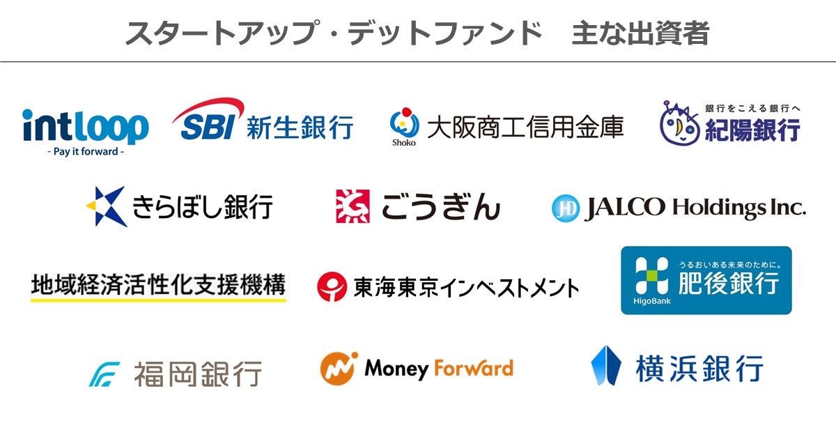 INTLOOP株式会社、株式会社SBI新生銀行、大阪商工信用金庫、株式会社紀陽銀行、株式会社きらぼし銀行、株式会社山陰合同銀行、JALCOホールディングス株式会社、株式会社地域経済活性化支援機構、東海東京インベストメント株式会社、株式会社肥後銀行、株式会社福岡銀行、株式会社マネーフォワード、株式会社横浜銀行等