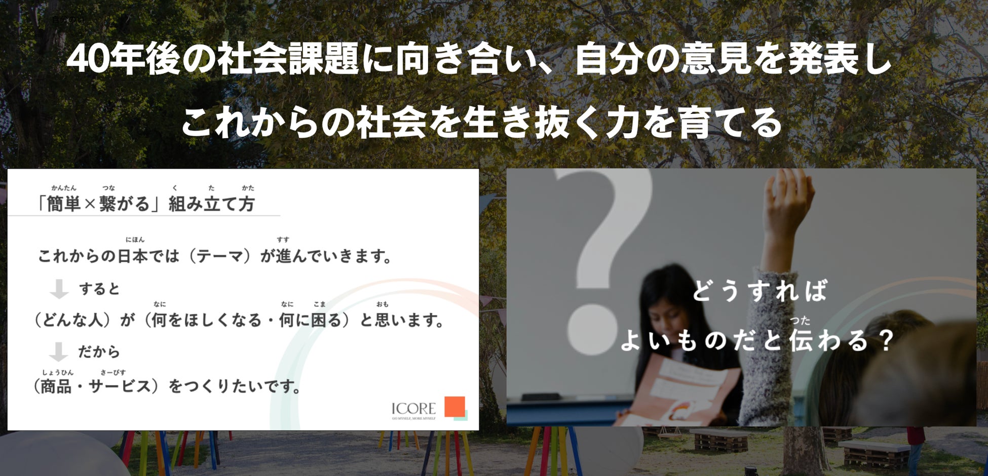 ICORE KIDSでは、幼少期から本当にやりたいことを見つけて、形にする体験を提供することを通して、1人でも多くの子供が主体的に自分の人生を生きられる社会を目指し、キャリアスクールで大人向けに実施している仕事を作るマーケティングや自己理解のノウハウを活かした子ども向けカリキュラムを提供しています。