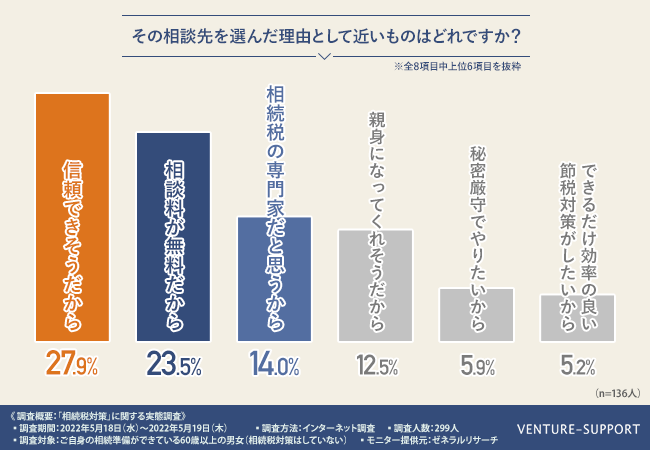 「信頼できそうだから(27.9%)」「相談料が無料だから(23.5%)」「相続税の専門家だと思うから(14.0%)」という結果となった。