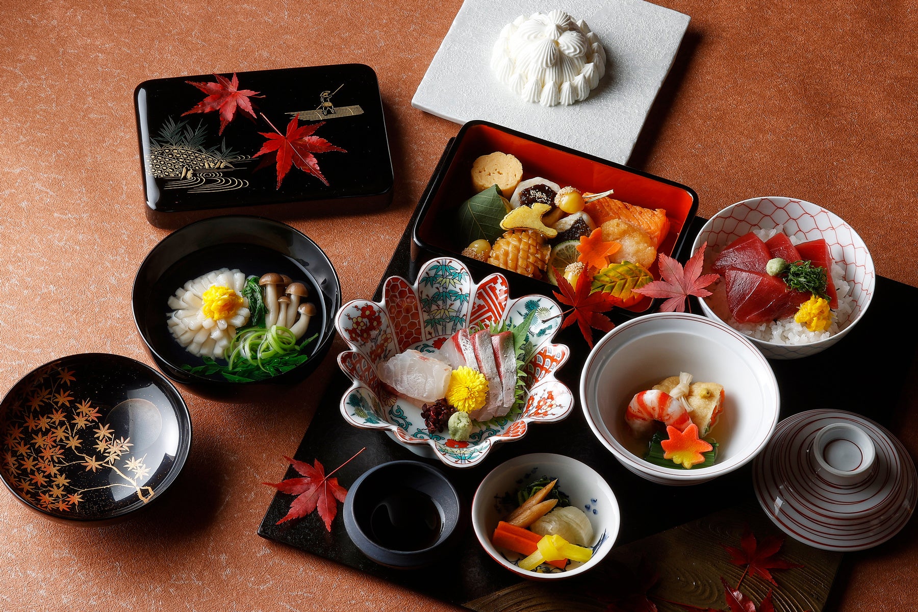 秋鮭や秋野菜などの旬の食材を用い、赤や黄色に色づく木の葉をイメージした飾り切りなど日本情緒あふれるお料理を料理箱に盛り込みました。まぐろご飯や煮物、笠間産の新栗をつかったプレミアムマロンシャンテリーとともにご提供します。