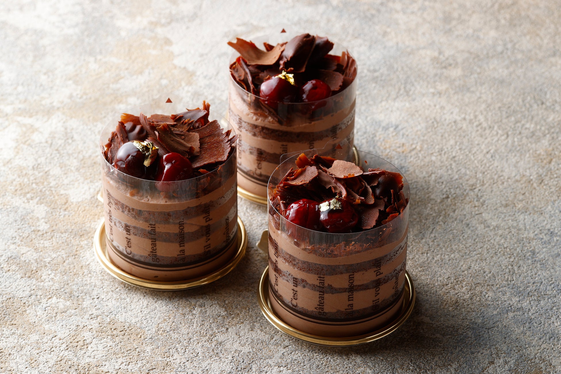 チョコレート味のスポンジにチョコレートの生クリーム、柔らかく煮たグリオットチェリー、カシスのコンフィズリーを重ねたスイーツ。薄く削ったチョコレートとグリオットチェリーをトッピングしてご提供します。ビターな味わいをお楽しみください。