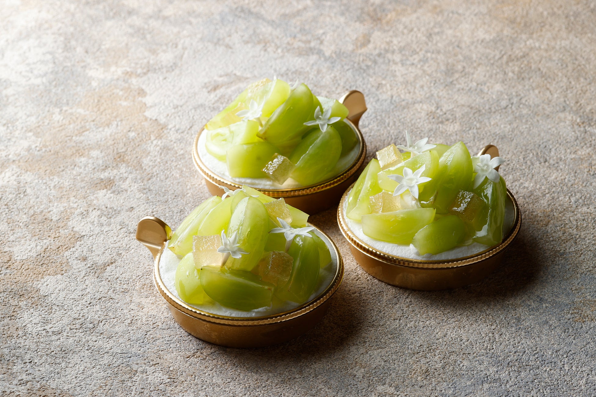 爽やかでクリーミィな味わいのレアチーズタルトに、みずみずしいシャインマスカットを飾り付けました。味覚のアクセントとして洋梨でつくったジャムをサンドし、表面にも洋梨のパートドフリュイを添えています。