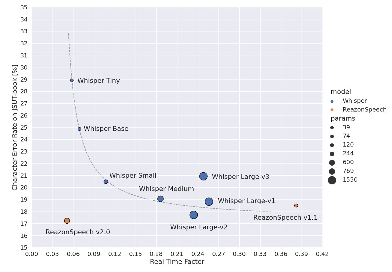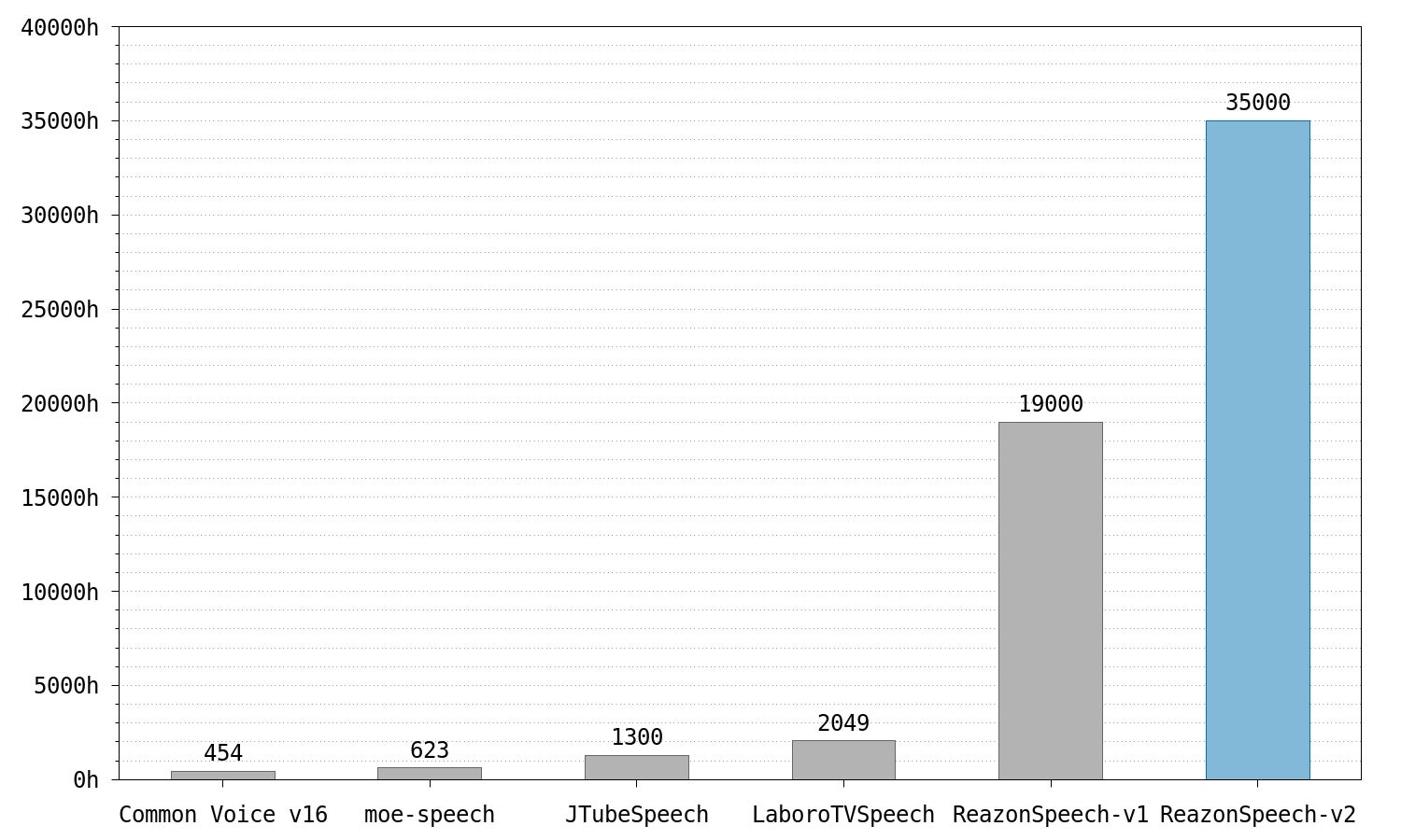 「ReazonSpeech v2」では、ReazonSpeechの自由なライセンスなどを引き継いだ上、音声認識コーパスの量を1.8倍の35,000時間に増やし、また新たな音声認識モデルの導入によって認識速度の向上を図ったものです。