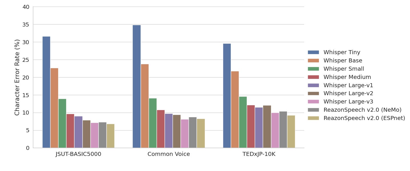ReazonSpeech-v2 (ESPnet) ReazonSpeech-v2(NeMo)ともに、検証データセットでのCERが良好であることを示しています。