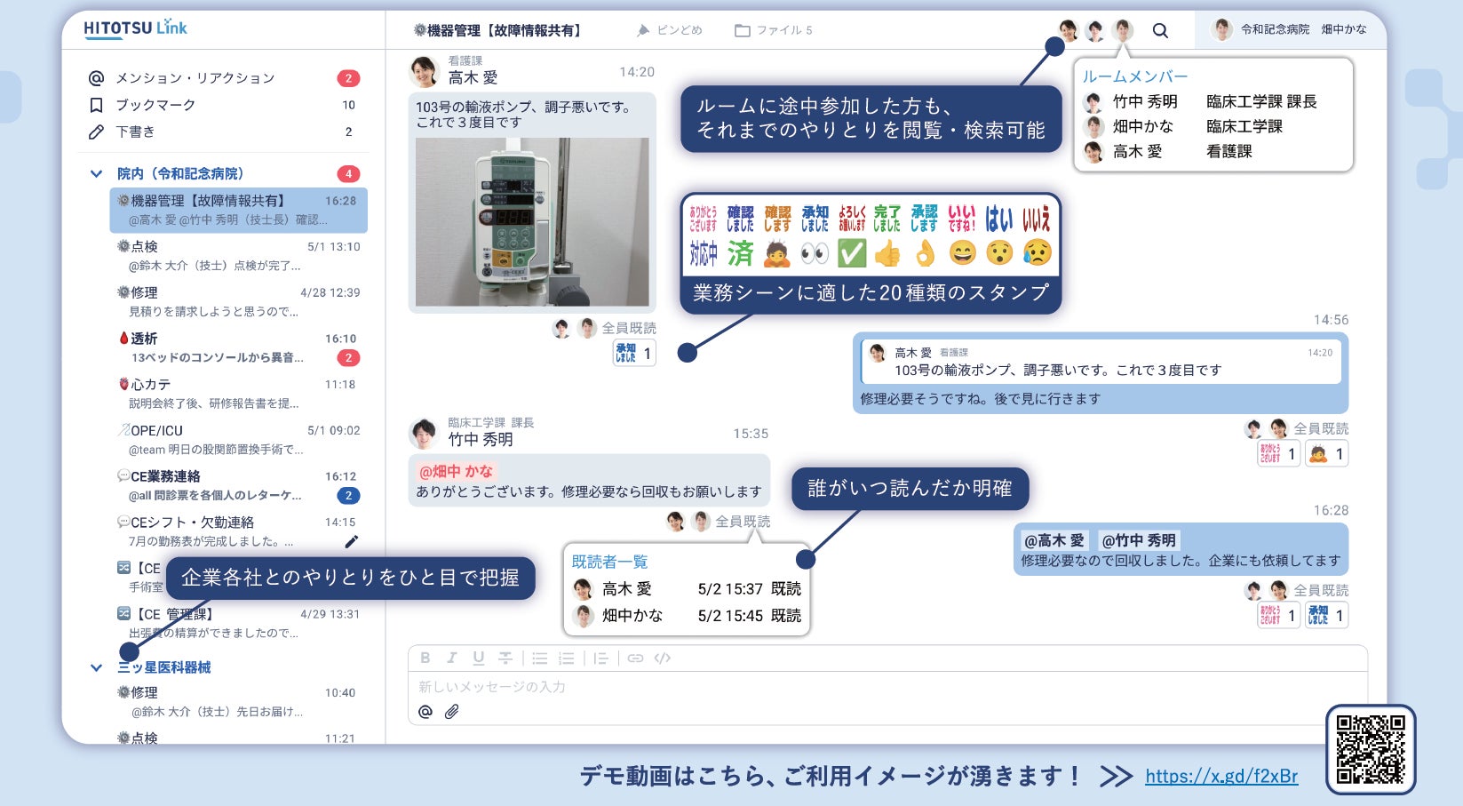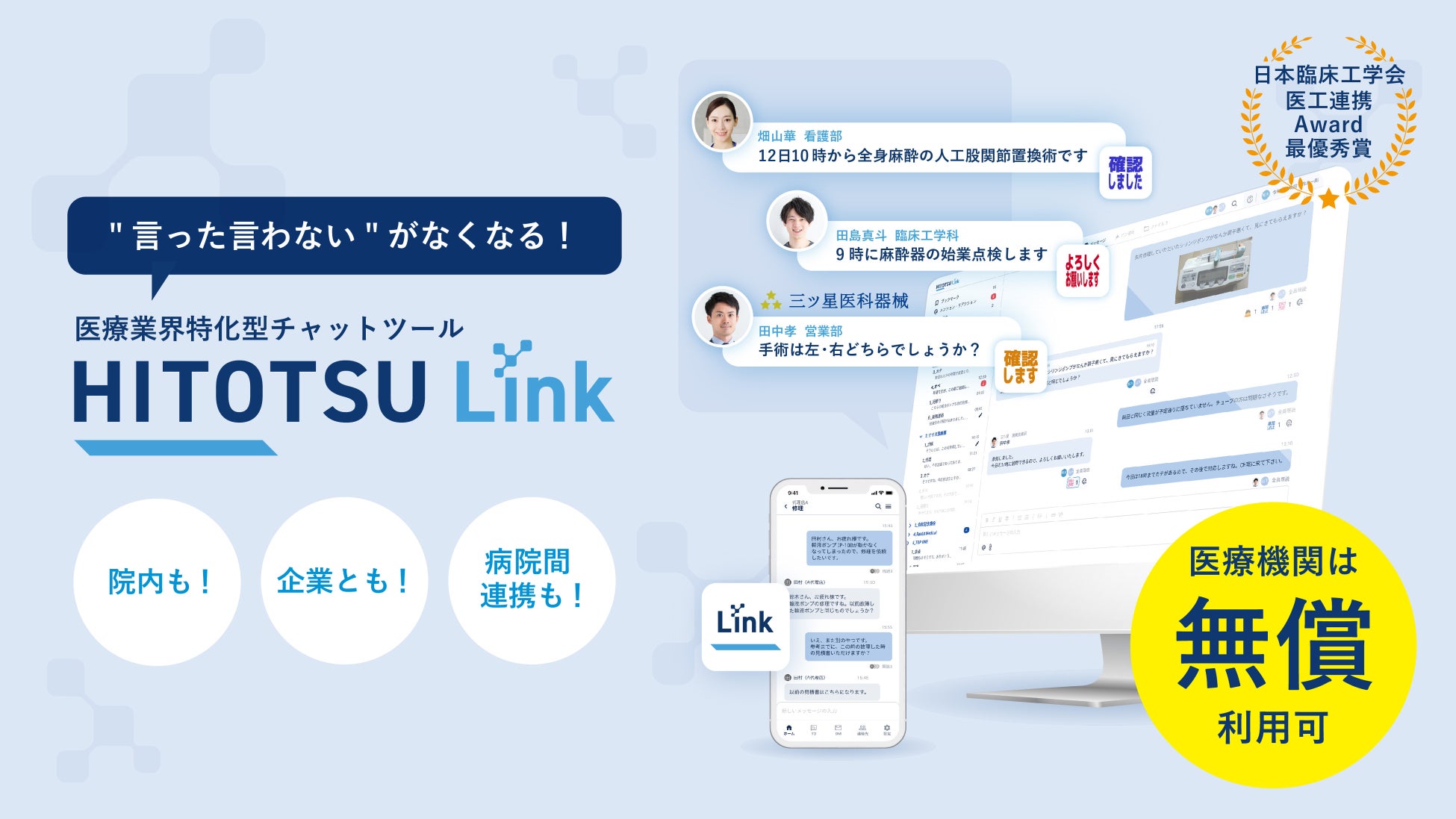 HITOTSUは、「言った言わない」等の院内および院外でのコミュニケーションの非効率性および取引企業も含めた収益性低下の解消を目指し、医療業界特化型チャットツールHITOTSU Linkを2024年3月にリリースしました。医療機関は無償で利用でき、他院や企業とも1ツールで接続できる業務用チャットツールとして、現在までに70を超える医療機関に導入・活用いただいております。当社は情報セキュリティマネジメントシステムの国際規格であるISMS認証「ISO/IEC 27001:2013」の取得をはじめ、クラウドならではの堅牢なセキュリティ・災害対策を講じており、安心してご利用いただけます。