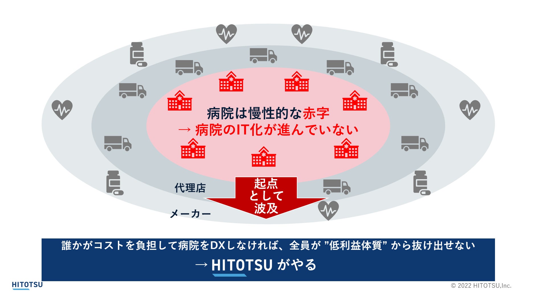 一方、業界全体でDXが遅れている要因として、医療提供体制のキーステークホルダーである「病院」が慢性的な赤字であり、IT化に投資する体力が十分ないことが挙げられます。誰かがコストを負担して病院をDXしなければ、代理店やメーカーを含む全員が低利益体質から抜け出せないと考え、HITOTSUは医療機関のHITOTSU Link利用料を負担しています。HITOTSU Linkを医療機関に無償で提供しているのはこのためです。代理店やメーカーなどの医療関連企業には、営業生産性向上の対価として、接続先医療機関様の病床数に応じた費用をいただくビジネスモデルとしています(一定条件で接続料が無償となるパートナーシップ応援制度あり、詳細は企業向けリーフレットをご覧ください)。