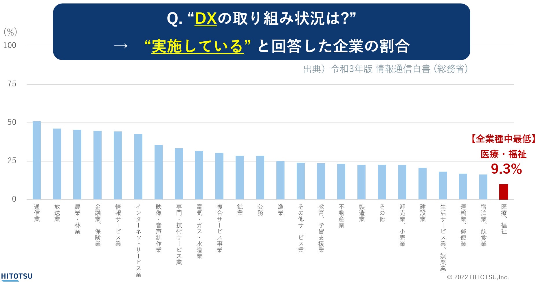 医療業界は全業種の中で最もDXが遅れています。特に旧態依然とした非効率が存在しているのが、あらゆる業務の基盤となる“コミュニケーション”です。院内スタッフ同士ではPHSや対面、医療機関‐企業間コミュニケーションは電話、ファクス、紙資料の手渡しといった、“言った言わない”やすれ違いによる業務の質低下と非効率が日常的に発生しています。