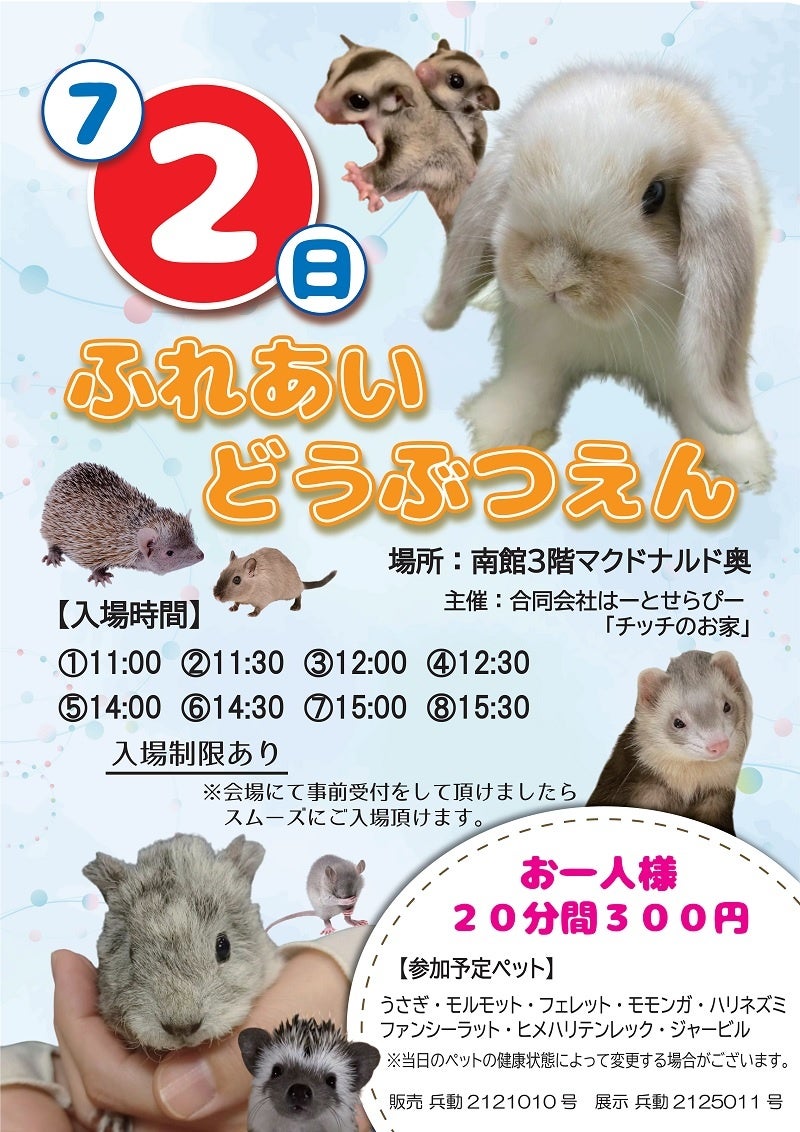 ショッピングセンター『エコール・リラ』において『ふれあいどうぶつえん』を開催!(主催:合同会社はーとせらぴー「チッチのお家」)2023年7月2日(日)