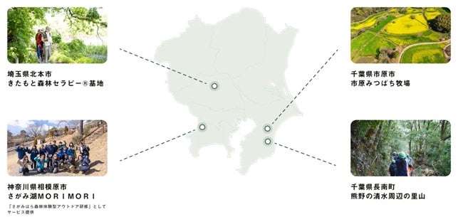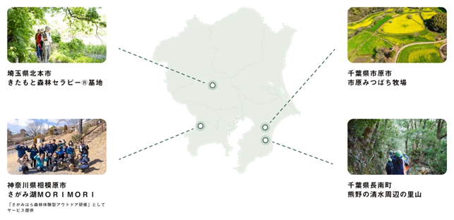 本研修サービスでは、神奈川県相模原市、埼玉県北本市、千葉県市原市、長南町をはじめとした、首都圏近郊の豊かな森林を舞台に、森林浴・里山整備体験・座学とグループワークを組み合わせた、実践型プログラムを提供しています。