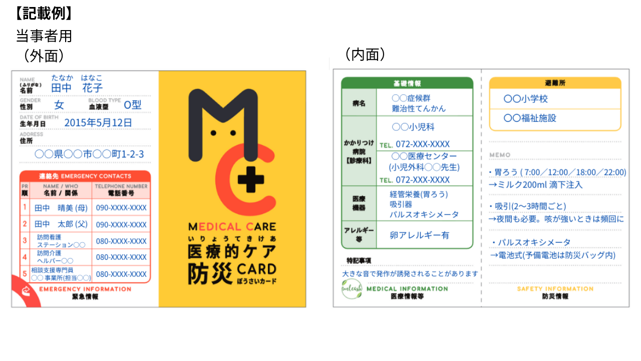 災害時に必要な医療情報をすぐに共有。医療的ケア児・病気障がい当事者用(使用医療機器、緊急連絡先などを記載)。一般用の(持病、アレルギー、避難場所などを記載)の2種類を展開。