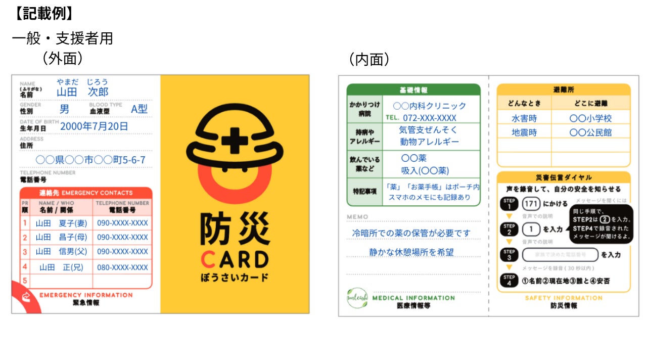 ②一般・支援者用: 持病やアレルギー情報、避難場所などを記載。支援者自身も自分の備えとして携帯することで、「支援の準備ができている」という意思表示にもなります 。