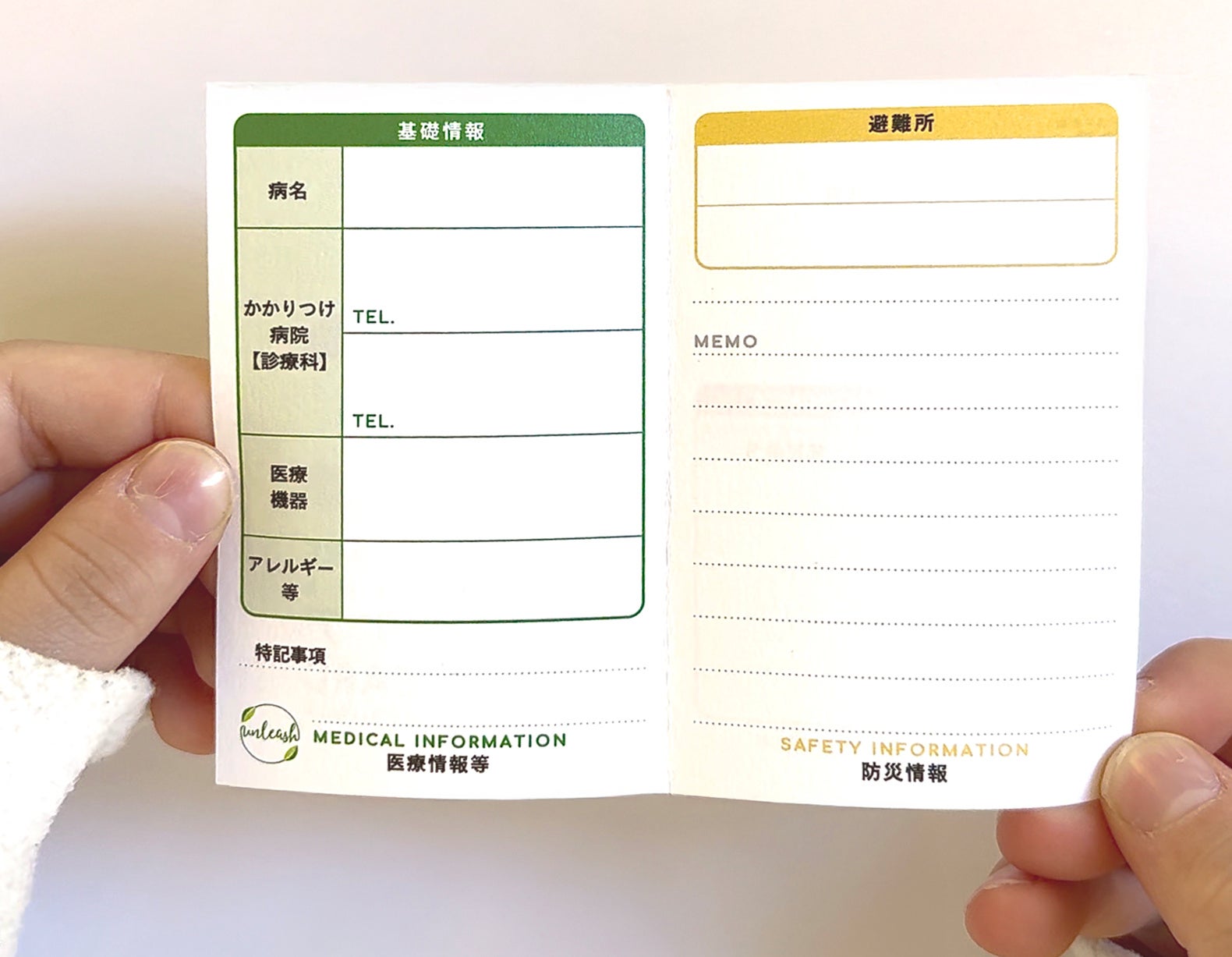 必要情報を一枚にまとめ、避難先でも本人の身体の状態を“瞬時に共有”できる仕様です。