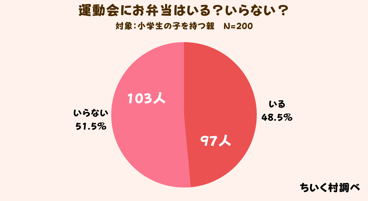 運動会にお弁当はいる?いらない?と聞いたところ、「いらない」と答えた人が200人中103人(51.5%)でした。