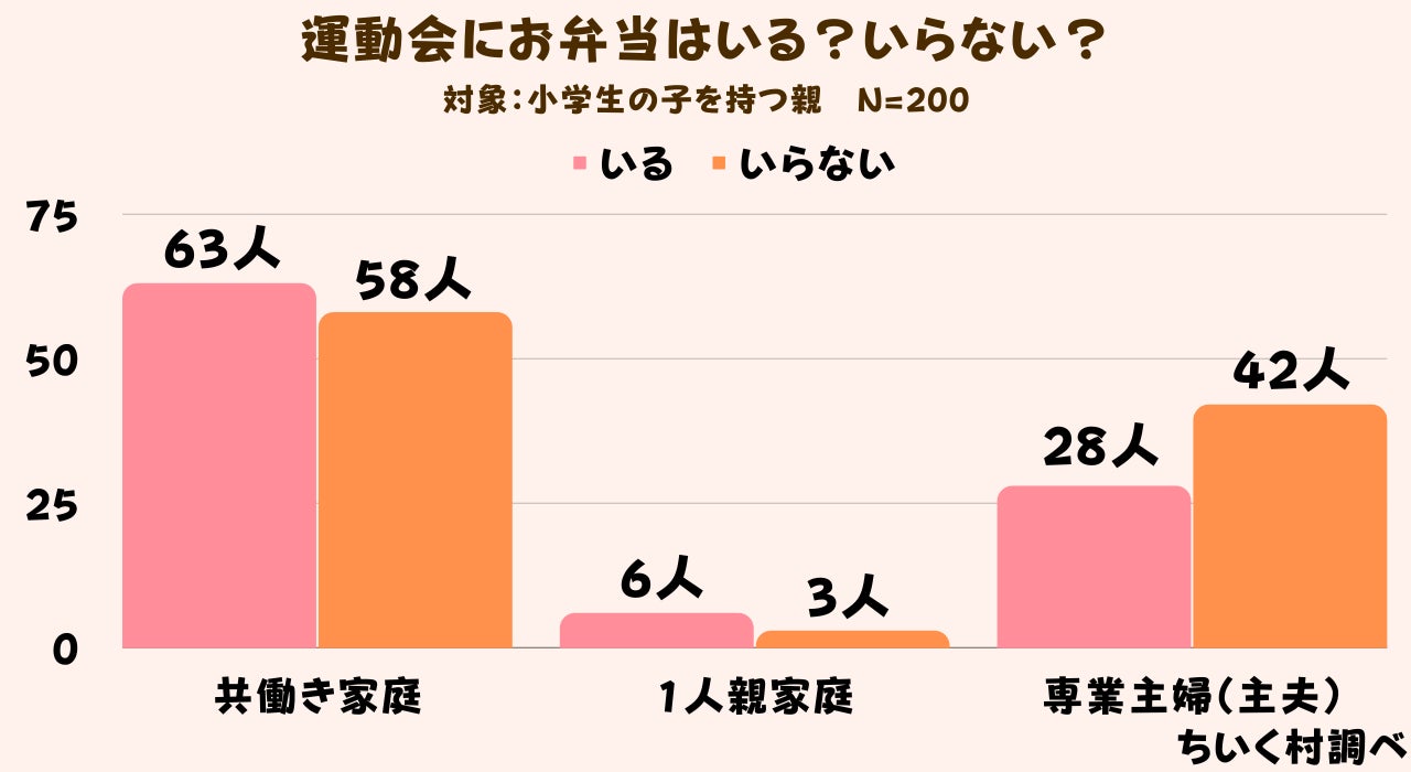 家庭環境別に運動会にお弁当はいる?いらない?と聞いてみたところ、共働き家庭、1人親家庭では、「いる」と答えた人が多かったですが、専業主婦(主夫)の方は「いらない」と答えた人が多数派でした。