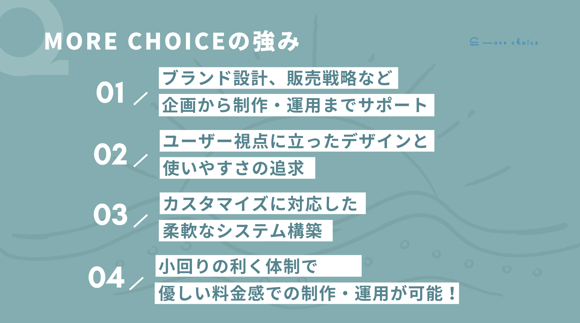 株式会社MoreChoiceでは、Shopifyの制作だけでなく申請面での手厚いサポートもいたしますので、ご相談だけでもご連絡ください。