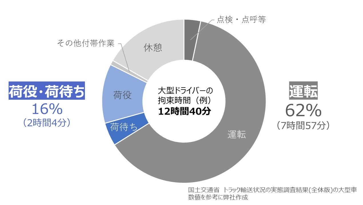 トラックドライバーは運転以外と所定の休憩時間の他、荷役や荷待ちに多くの時間を費やしている。納品伝票の電子化による手続き時間の短縮や、デジタル化したデータの活用による検品時間の短縮は、ドライバーの長時間労働の緩和につながると考えられる。