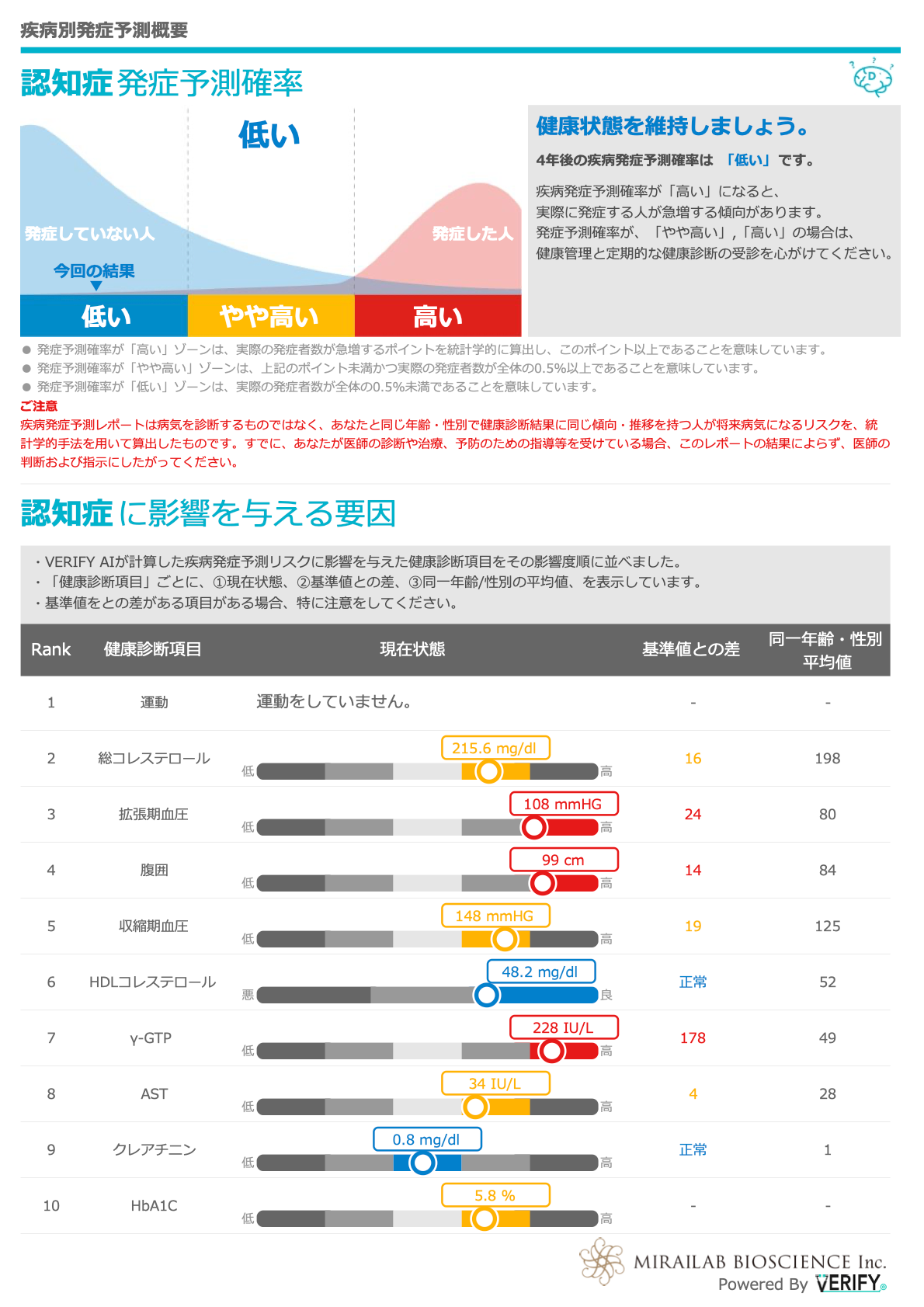 疾病予測レポートでは、各疾病ごとの発症リスク予測をグラフィカルに表示するととともに、AIが計算した発症リスク予測に影響を与えた健診項目をその影響度順に並べ、健診項目ごとに、①現在状態、②基準値との差、③同一年齢/性別の平均値を表示します。