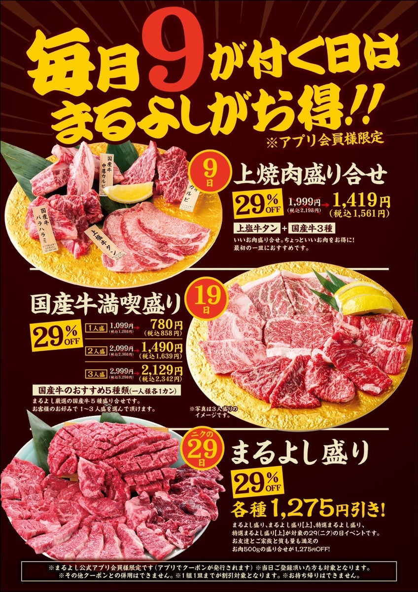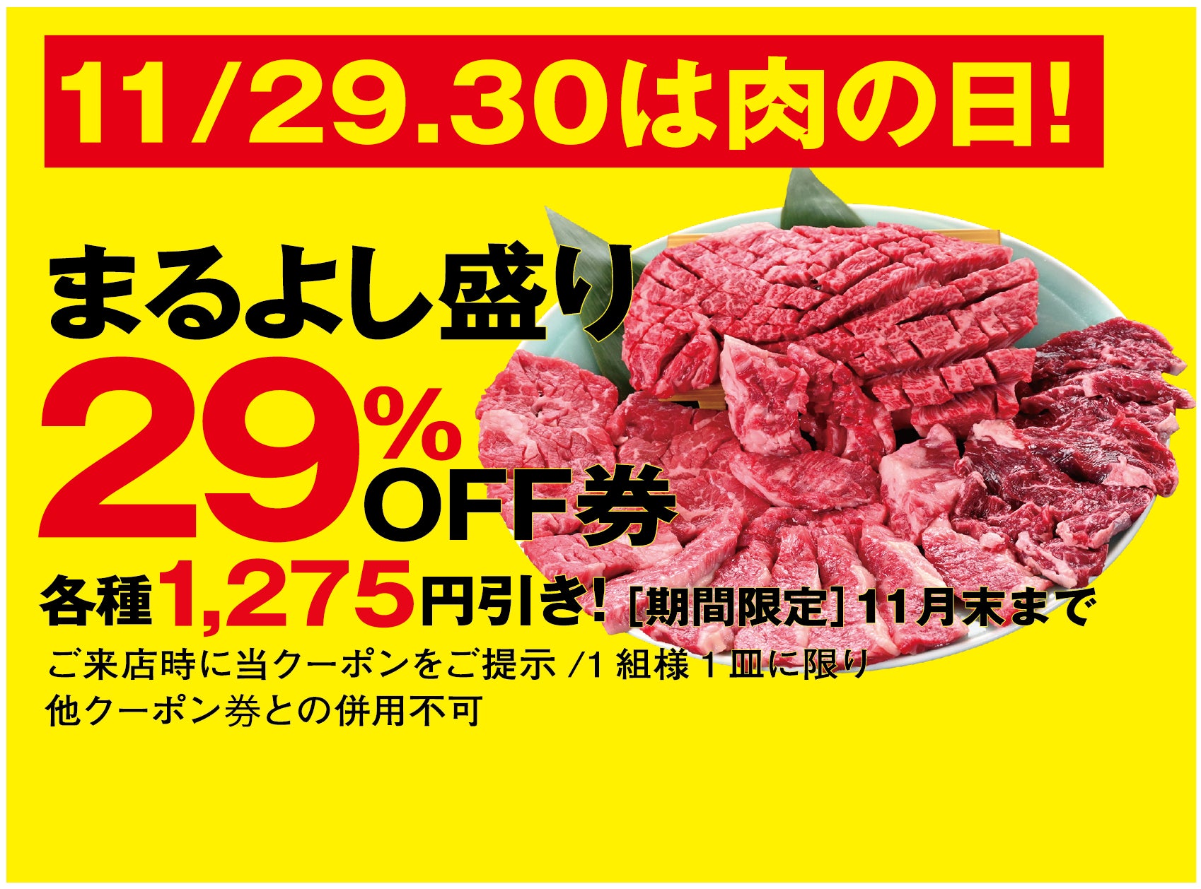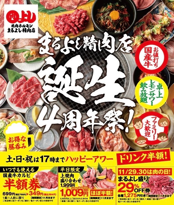 【まるよし精肉店-誕生4周年祭-】国産牛カルビ&上焼肉盛り合わせが半額、まるよし盛り29%OFF、17時までドリンク半額|11月限定で開催