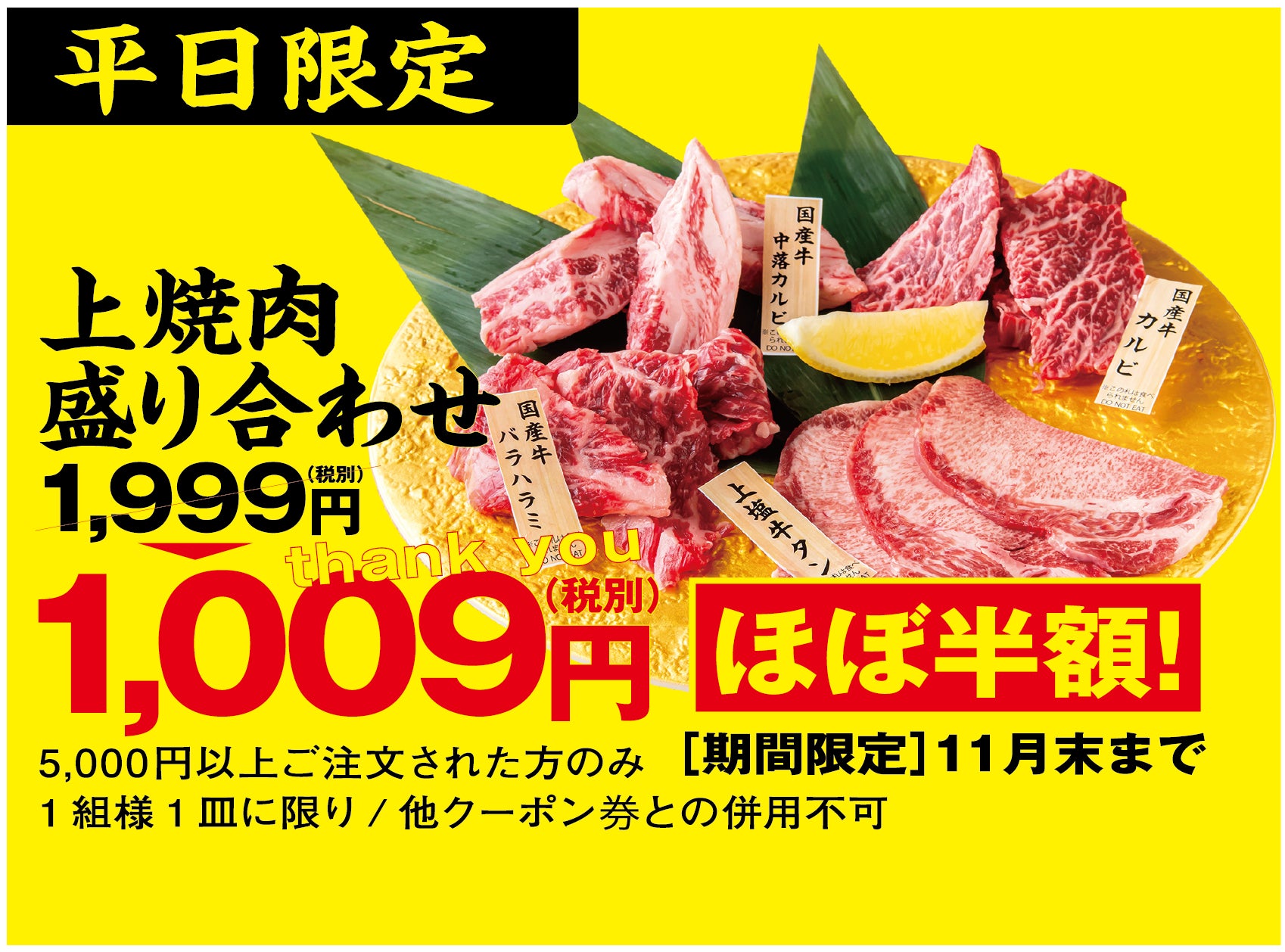 【平日は "Thank you" 価格!】上焼肉盛り合わせ ¥1,999 → ¥1,009