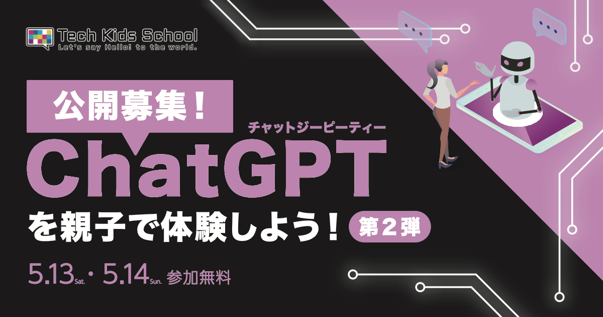 当社が運営する、小学生のためのプログラミングスクール「Tech Kids School(テックキッズスクール)」では、2023年3月末に、スクール生に向けた春休み特別企画として「ChatGPTを親子で体験しよう」ワークショップを実施いたしました。イベントには定員の倍を上回る応募が殺到したこと、また一般のかたからも多くのお問い合わせを頂戴したことを受け、再び第2弾を開催し、参加者の公開募集をすることを決定いたしました。