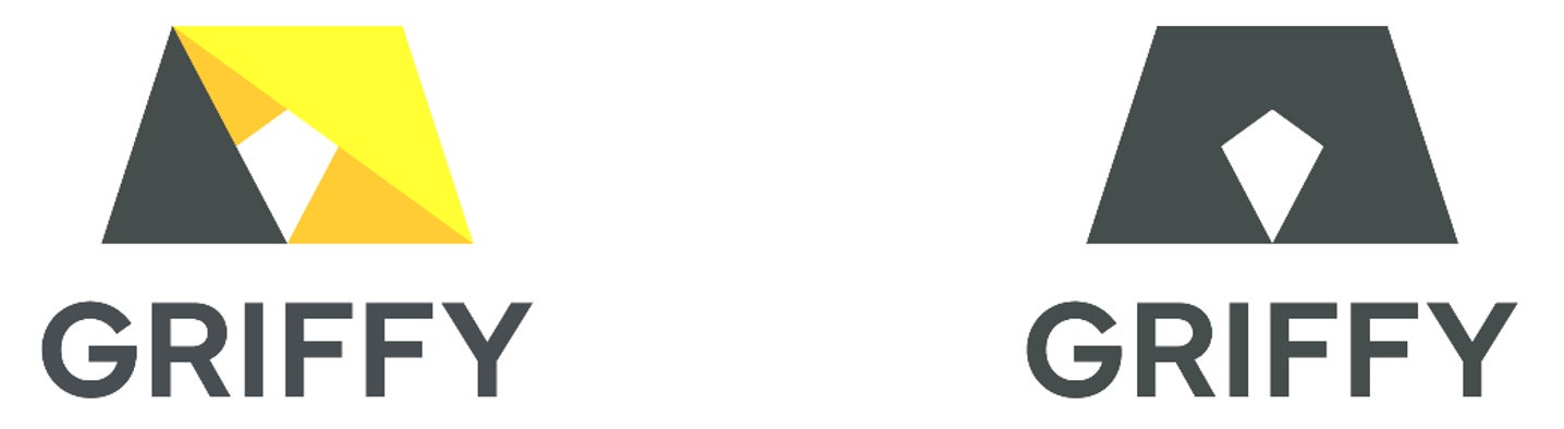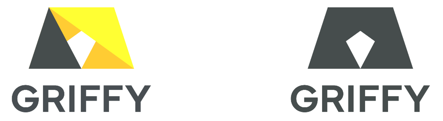 屋外の自然光を模した鮮やかなイエローと、人工創造物を表すマットグレーの三角形を立体的に組み合わせたアイコンは、盛り土や城の石垣といった土木構造物から受ける安定感と、異なる要素の調和によって生まれる新しい価値を表現しています。この形はモノクロ2階調で表示した際、正面を向いたグリフォンの頭部が認識されるようデザインされており、ワシとライオンを組み合わせたグリフォンの象徴的な姿同様に、アナログとデジタル、ヒトとAI、自然と人工物といった異質同士の融合から、力強い変化やパラダイムシフトを生み出す思いをこめています。