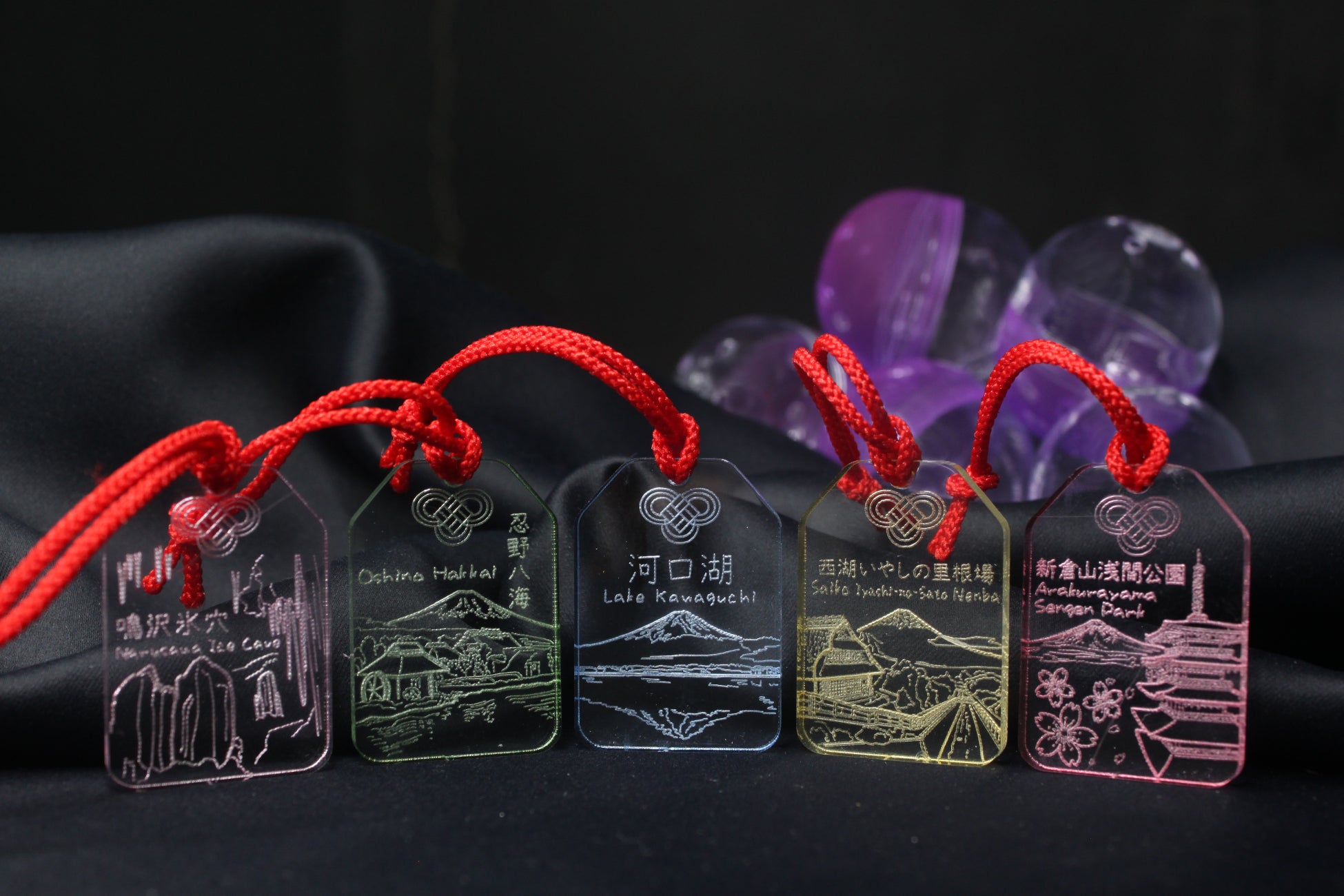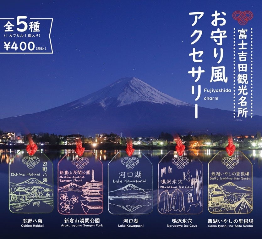 今回の新商品は、富士吉田市の5つの名所「河口湖」「新倉山浅間公園」「忍野八海」「鳴沢氷穴」「西湖いやしの里根場」をモチーフにしたお守り風アクセサリーです。富士吉田の自然や歴史を感じられ、訪れた思い出を形に残す特別なアイテムです。繊細に表現された風景と、縁起の良い赤い紐のデザインで、国内の観光客はもちろん、外国人観光客にも人気のある日本文化を感じられる記念品として、インバウンド市場でも高い注目を集めています。