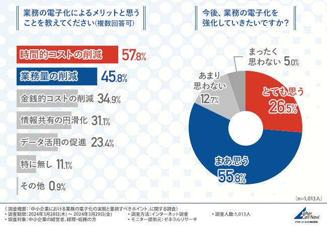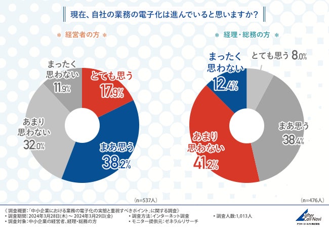 そこで今回、「企業向けソフトウェアの開発と販売(https://www.axs-f.com/)」を行うアフターコールナビ株式会社は、中小企業の経営者、経理・総務の方を対象に、中小企業における業務の電子化の実態と重視すべきポイントに関する調査を実施しました。