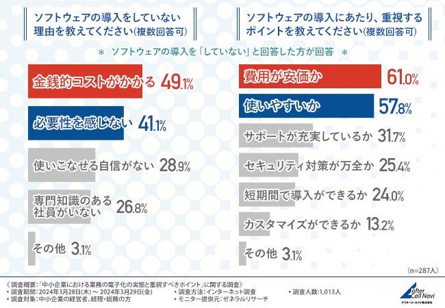 一方で、冒頭でソフトウェアを導入していないと回答した方に「ソフトウェアの導入をしていない理由を教えてください(複数回答可) 」と質問したところ、『金銭的コストがかかる(49.1%)』と回答した方が最も多く、次いで『必要性を感じない(41.1%)』と続きました。
