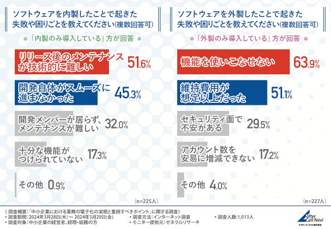 ソフトウェアを外製にした場合には、機能を使いこなせないといった使いにくさの問題が発生しやすいことがうかがえる結果になりました。
