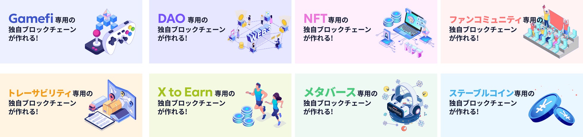 Web3の様々な領域での活用が可能です。GameFi、DAO、NFT、ファンコミュニティ、トレーサビリティ、X to Earn、メタバース、ステーブルコインなど、用途にあわせたオリジナルブロックチェーンを作ることができます。