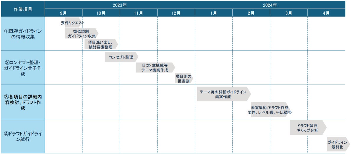 2023年内にコンセプト整理と基本骨子作成を行い、2024年4月を目途に ガイドラインの初版完成を予定しております。