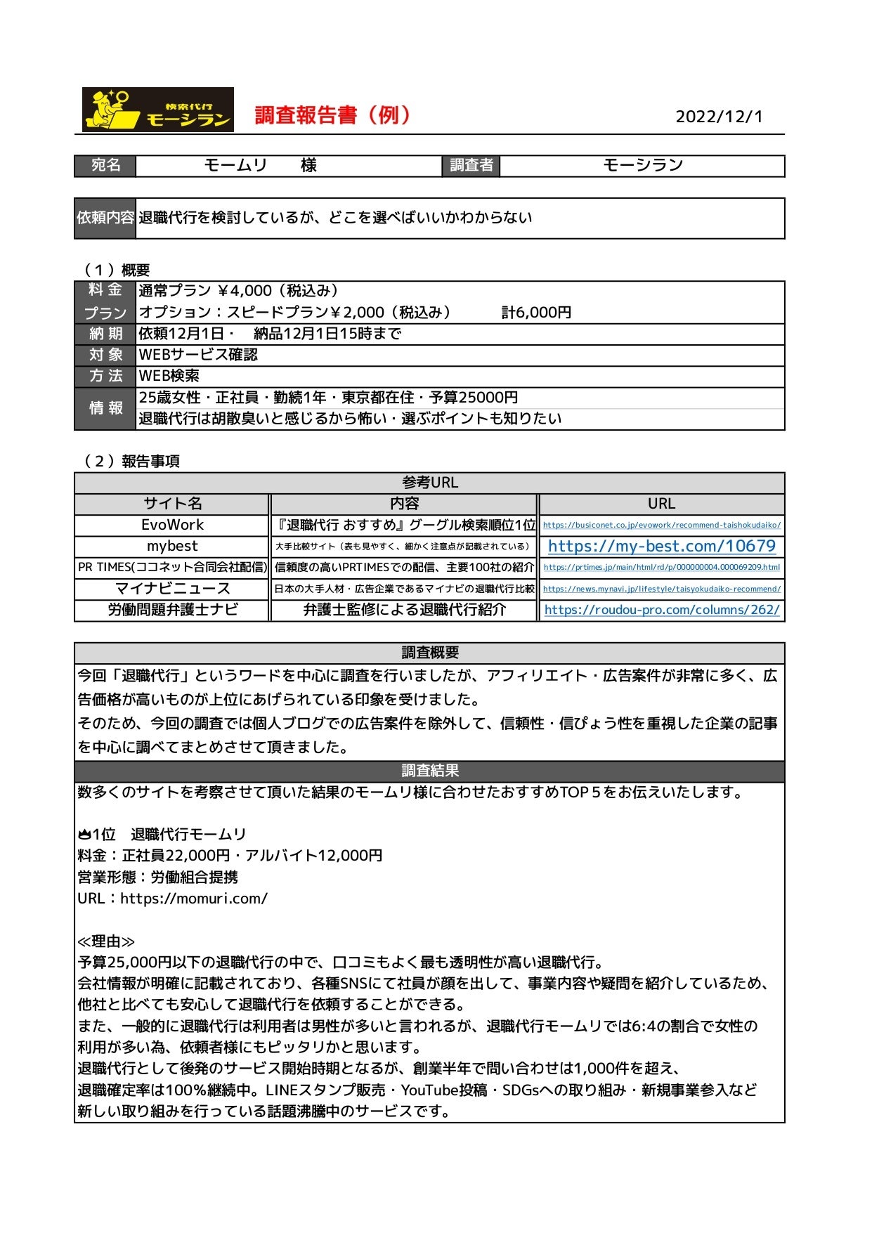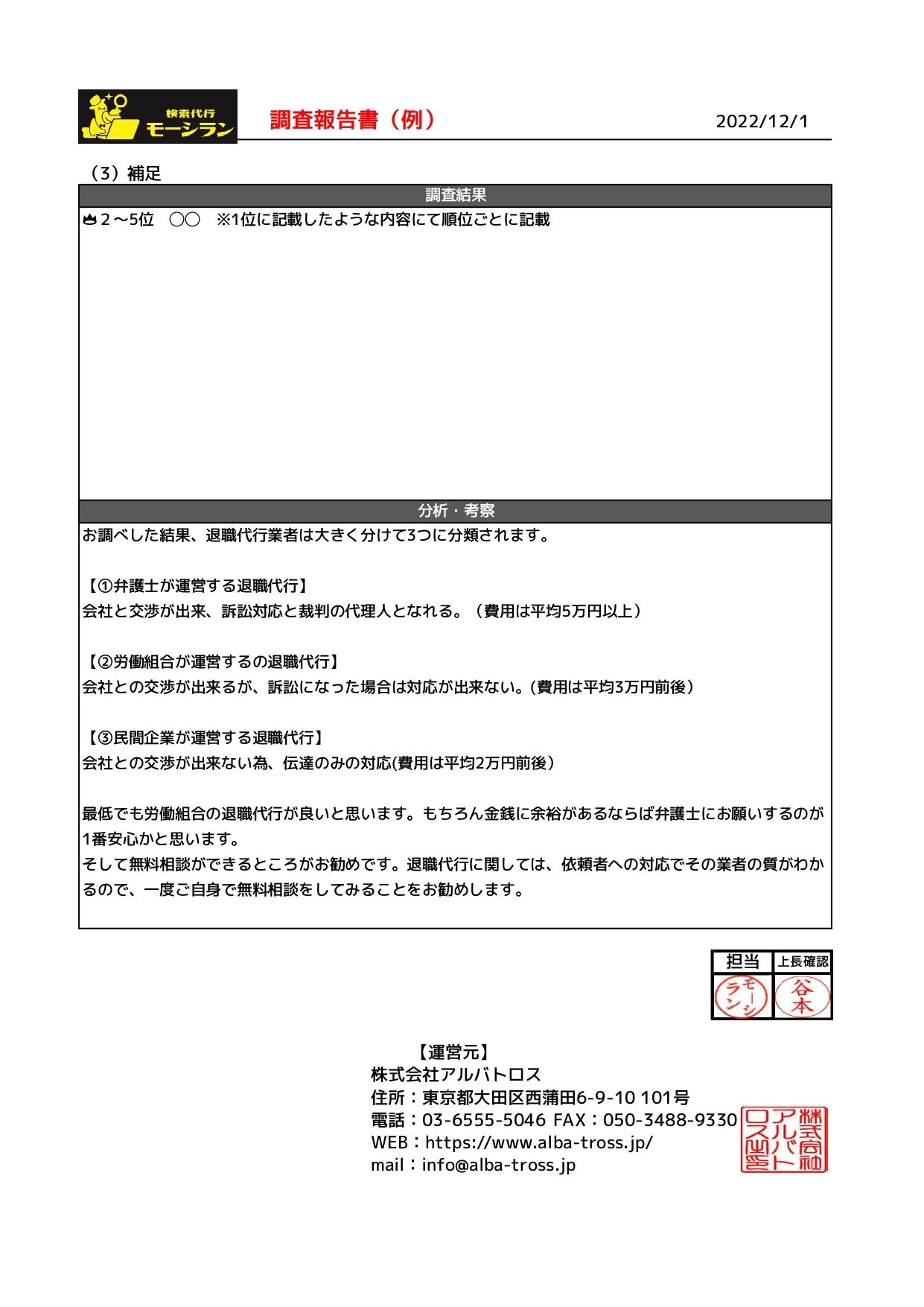 実際は依頼者の方に合わせた、依頼者の為だけの調査報告書を納品いたします。