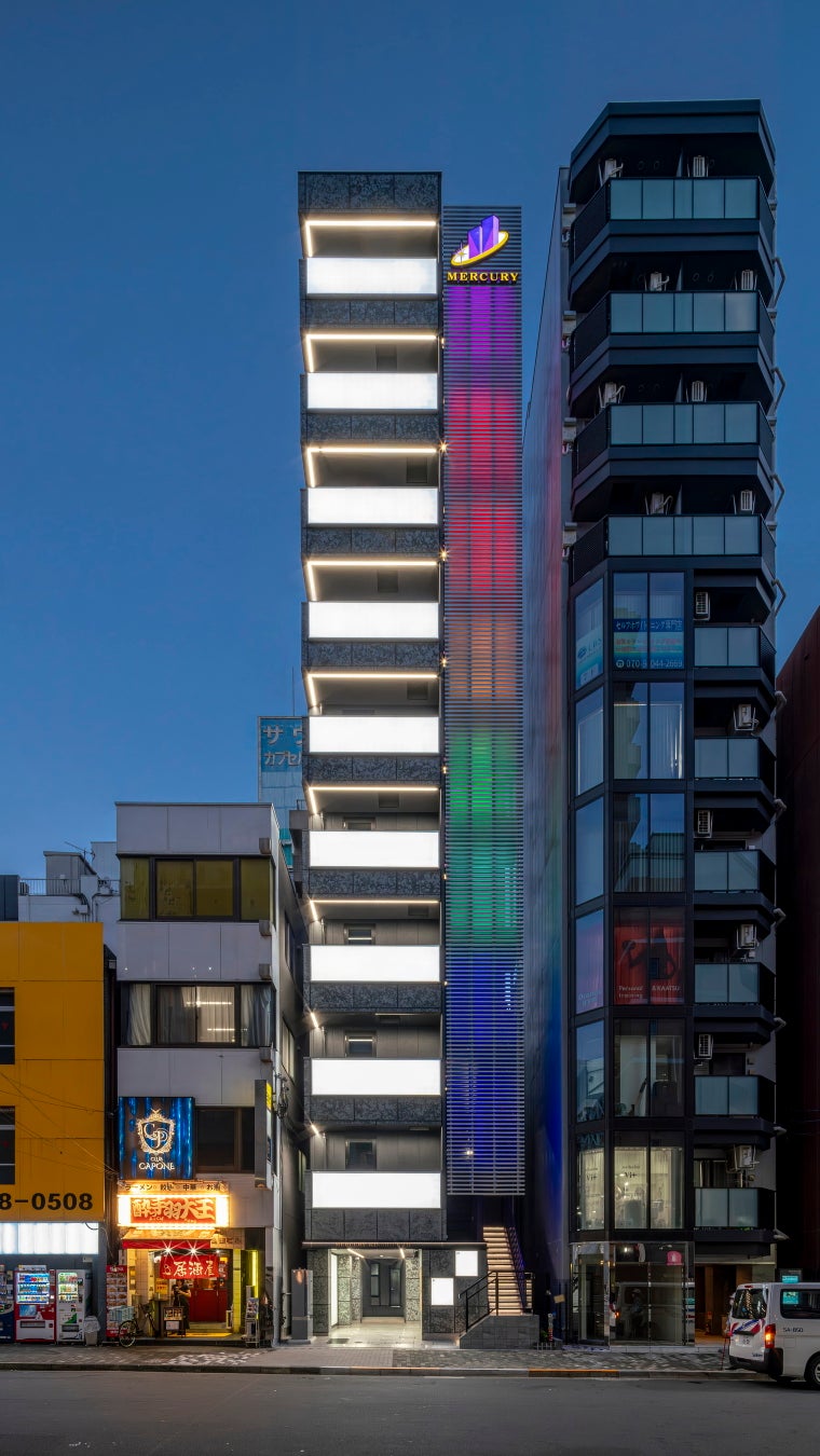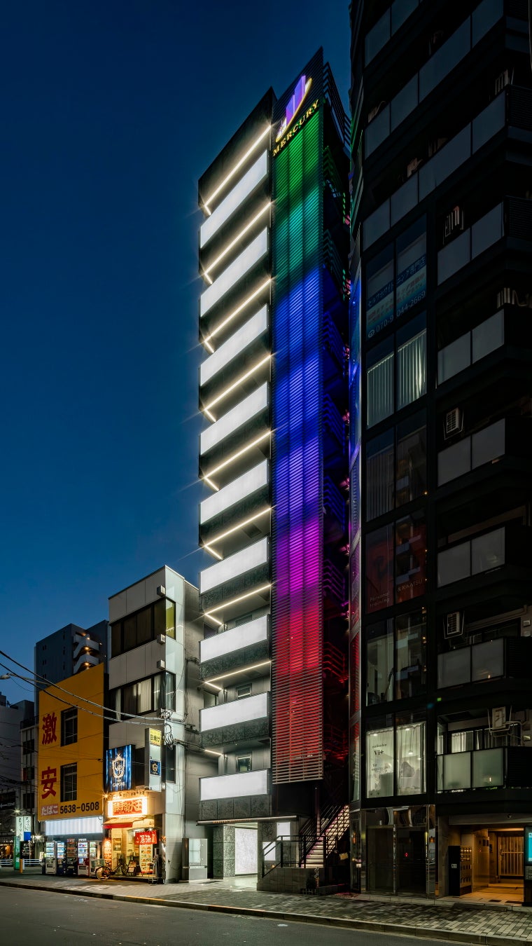「マーキュリー錦糸町Ⅱ」の外観は、錦糸町の活気を象徴するレインボーカラーのライトアップが特徴。昼間は洗練されたモダンなデザインで目を引き、夜にはレインボーカラーのライトが美しく輝き、街全体を照らし出します。この独自のデザインコンセプトは、多様性と未来への希望を象徴し、錦糸町の新たなシンボルとなることを目指しています。