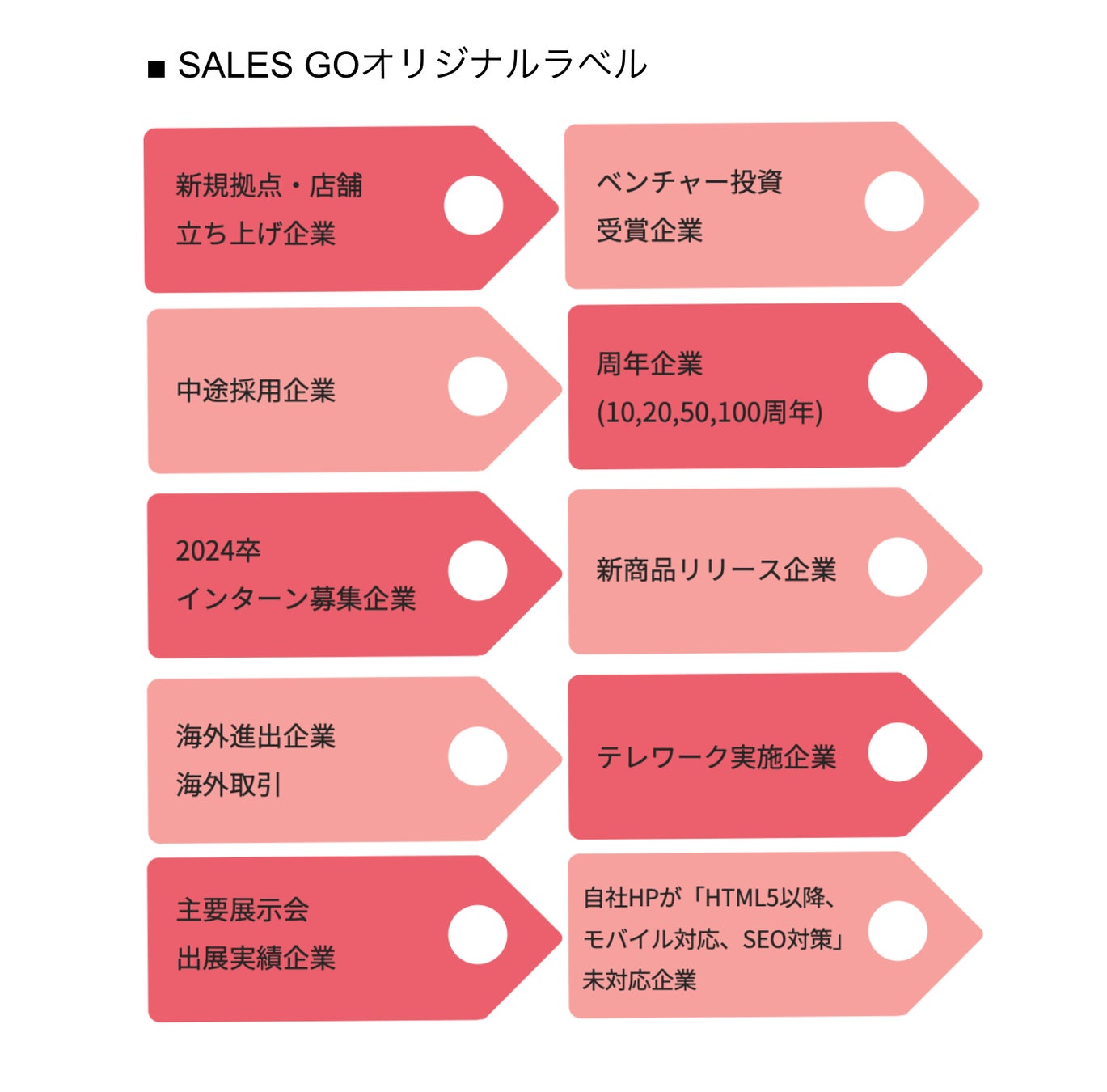 『SALES GO DATA』の特徴 ・リスト購入〜属性情報追加〜重複データの統合までこれひとつで完了 ・企業名とHPのURLを入力するだけで最新の企業情報を自動で補完 ・採用や新商品など、名刺だけでは収集が難しい企業情報をSALES GOオリジナルラベルで提供 |