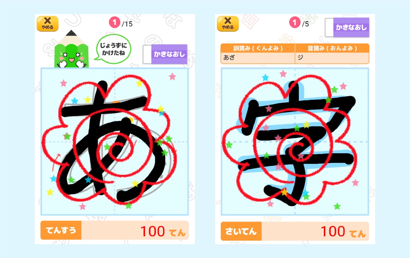 発音と書き順を覚えるゲームです。ひらがな、カタカナ、漢字、アルファベット、数字があります。