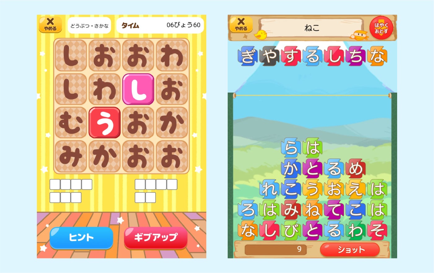 「たんごさがし」は、お題に沿って、隠れている単語を指でなぞって見つけていきます。また「ひらがなシューター」は、表示された単語と同じひらがなを探してタップし消していくゲームです。