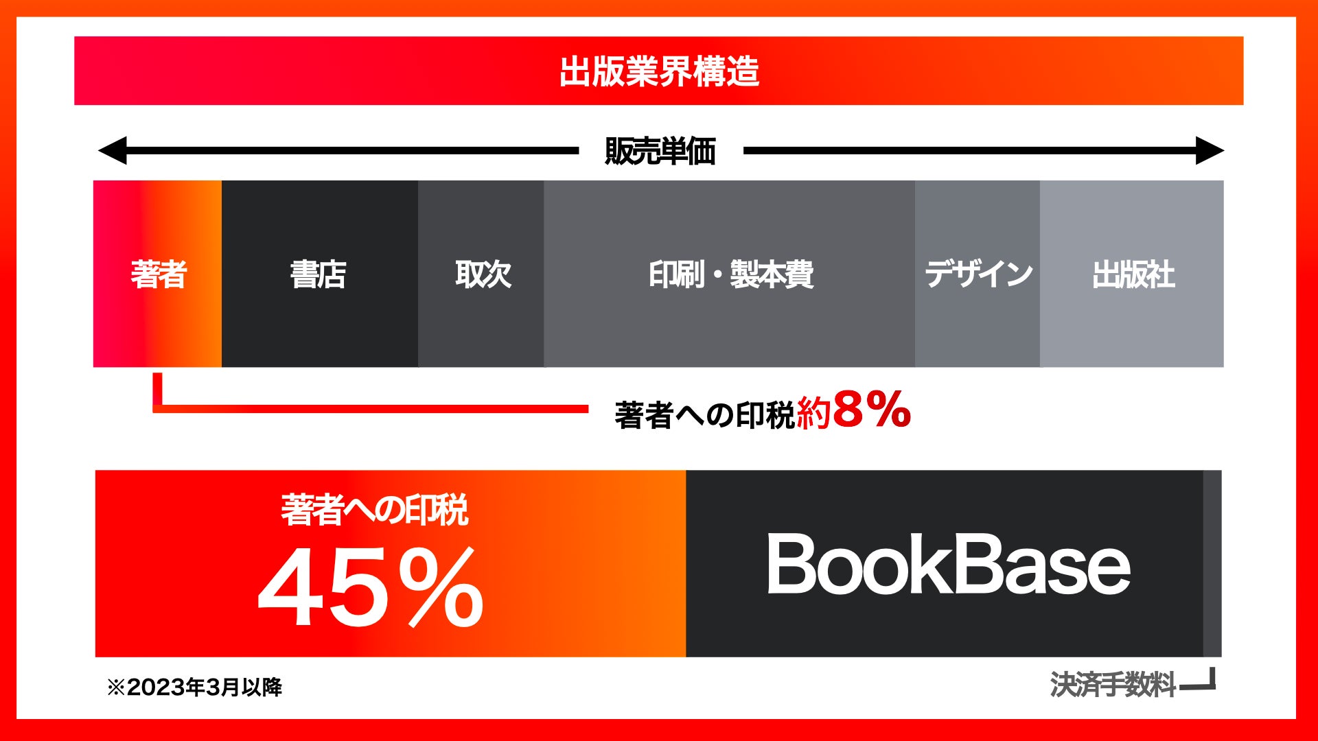 これに対してBookBaseでは、電子書籍を主体とするオンラインプラットフォームにてワンストップで制作から販売までを行うことができるシステムとすることで、従来の出版社と同様のサポート体制をつくりながら、印税45%(2023年3月以降)とこれまでの約5〜6倍の高還元率を実現しています。