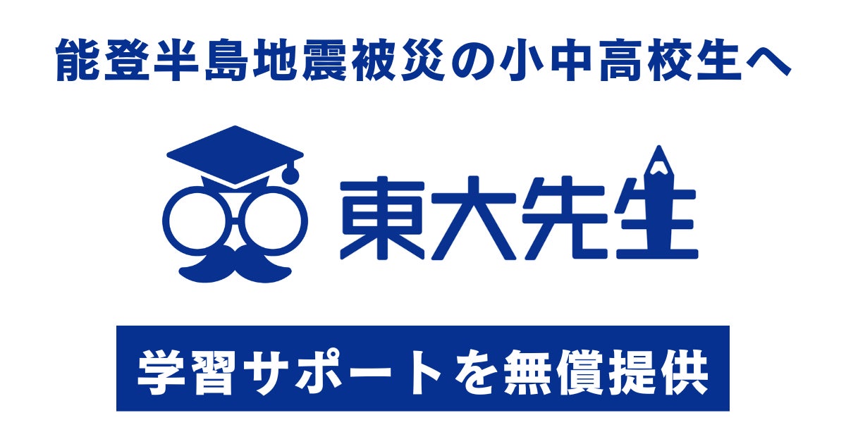 株式会社東大先生(代表取締役社長:堀井崇史)は、震災被害への支援として、東大生が厳選した教材集、解説集と受験対策有料セミナー動画を無償提供します。受験を希望する全ての生徒様の指導にご活用いただけますと幸いです。