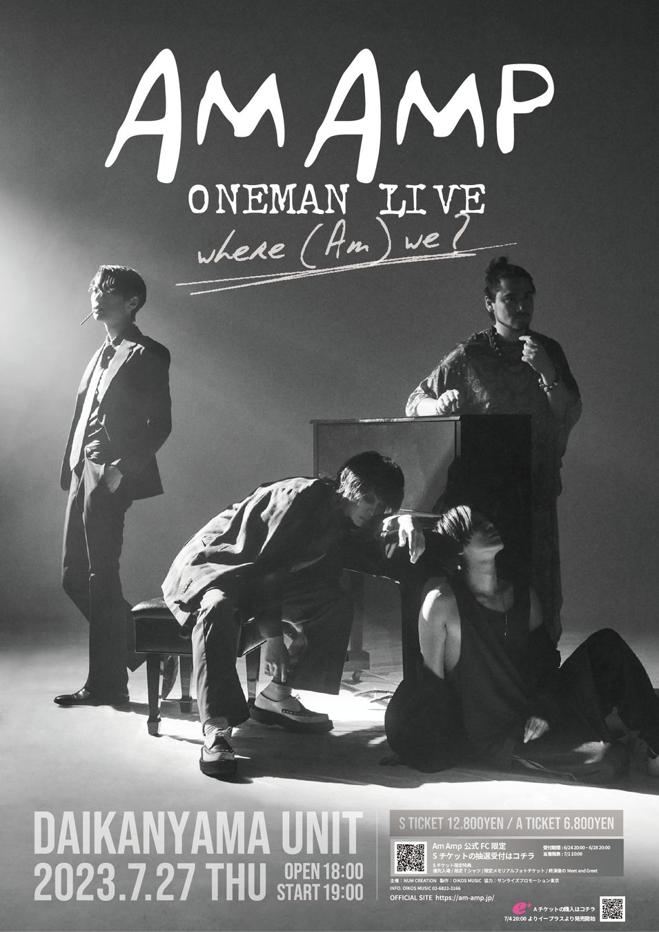 また、1st ワンマンライブ「where (Am) we?」実施に先駆け、Am Amp 公式ファンクラブ「CABINETS(https://am-amp.jp/)」を6月24日(土)に開設、6月24日20:00〜6月28日 20:00まで、ファンクラブ会員限定で、ライブ終演後にメンバーと会える権利やオリジナルデザインTシャツなどの特典付きスペシャルチケットの抽選受付を行います。一般チケットは、7月4日(火)よりイープラスにて販売を開始します。